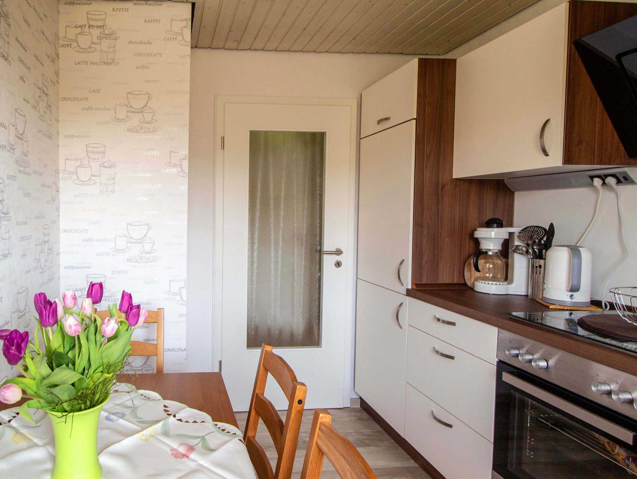 In der sehr gut ausgestatteten Küche mit Essecke ist vom Kühlschrank, Mikrowelle, Spühlmaschine, einen Herd mit Ceranfeld sowie einer Kaffeemaschine bis zum Wasserkocher und Toaster alles vorhanden.