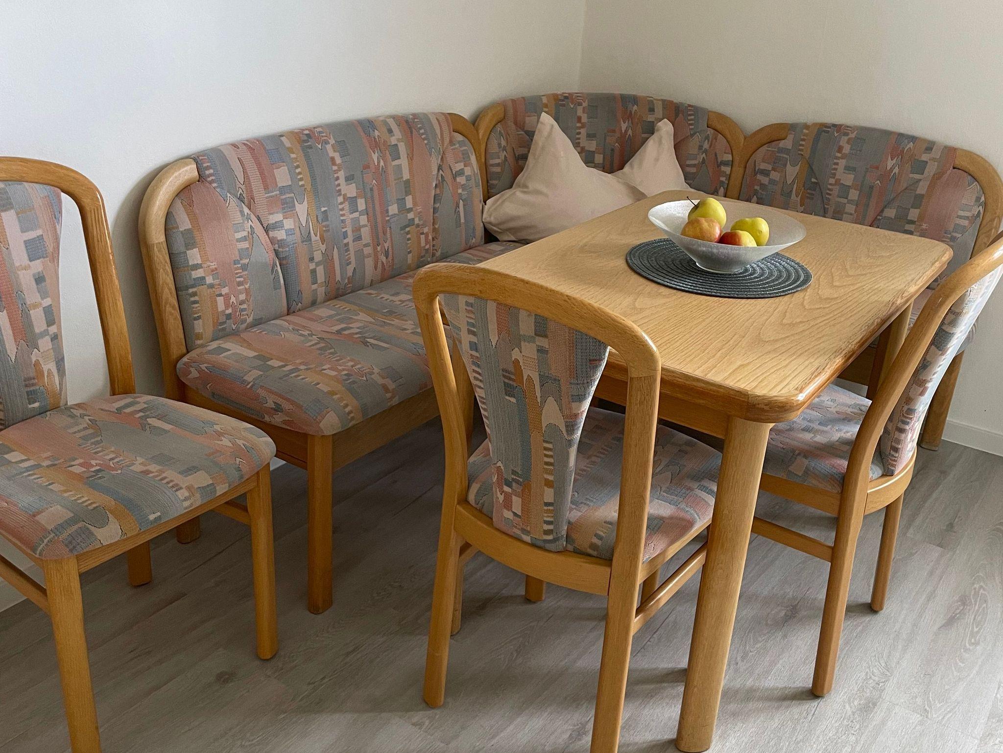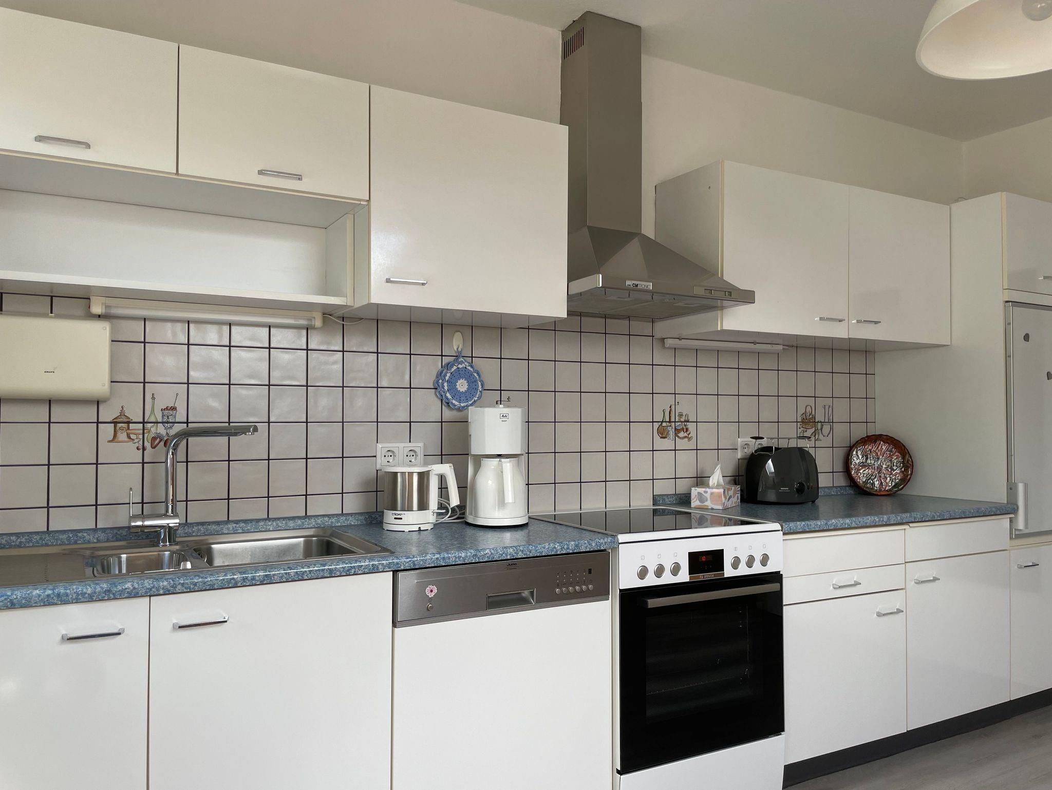· Küche mit Essgruppe, Backofen, Spülmaschine, Mikrowelle, Kaffeemaschine, Kühlschrank, Gefrierschrank