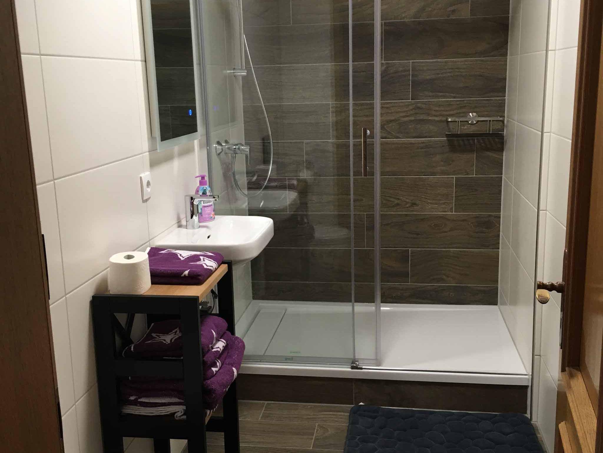 Das Bad mit großer Dusche, Waschtisch mit berührungsloser Armatur, Wand-WC, beleuchtetem Spiegel.