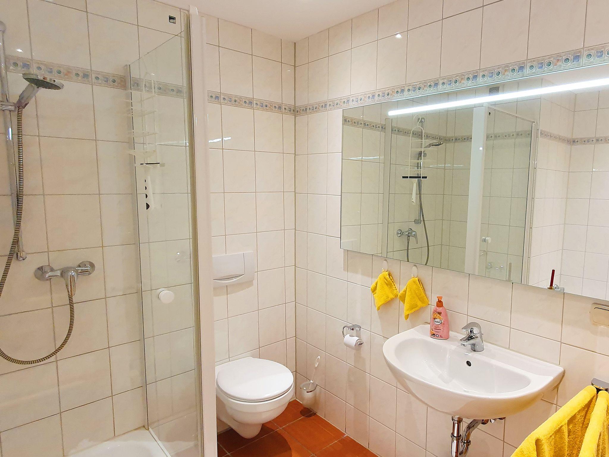 Ferienwohnung im 1. Obergeschoß mit großem komfortablem Wohn/Schlafraum, Küchenzeile mit Spülmaschine, 1 großes Schlafzimmer mit Doppel- und Einzelbett, zusätzliches Kinderbett möglich, Bad mit Wanne DU/WC und Fußbodenheizung, Sat-TV, seperater Eingang, Balkon mit Balkonmöbel, Nichtraucher. W-LAN