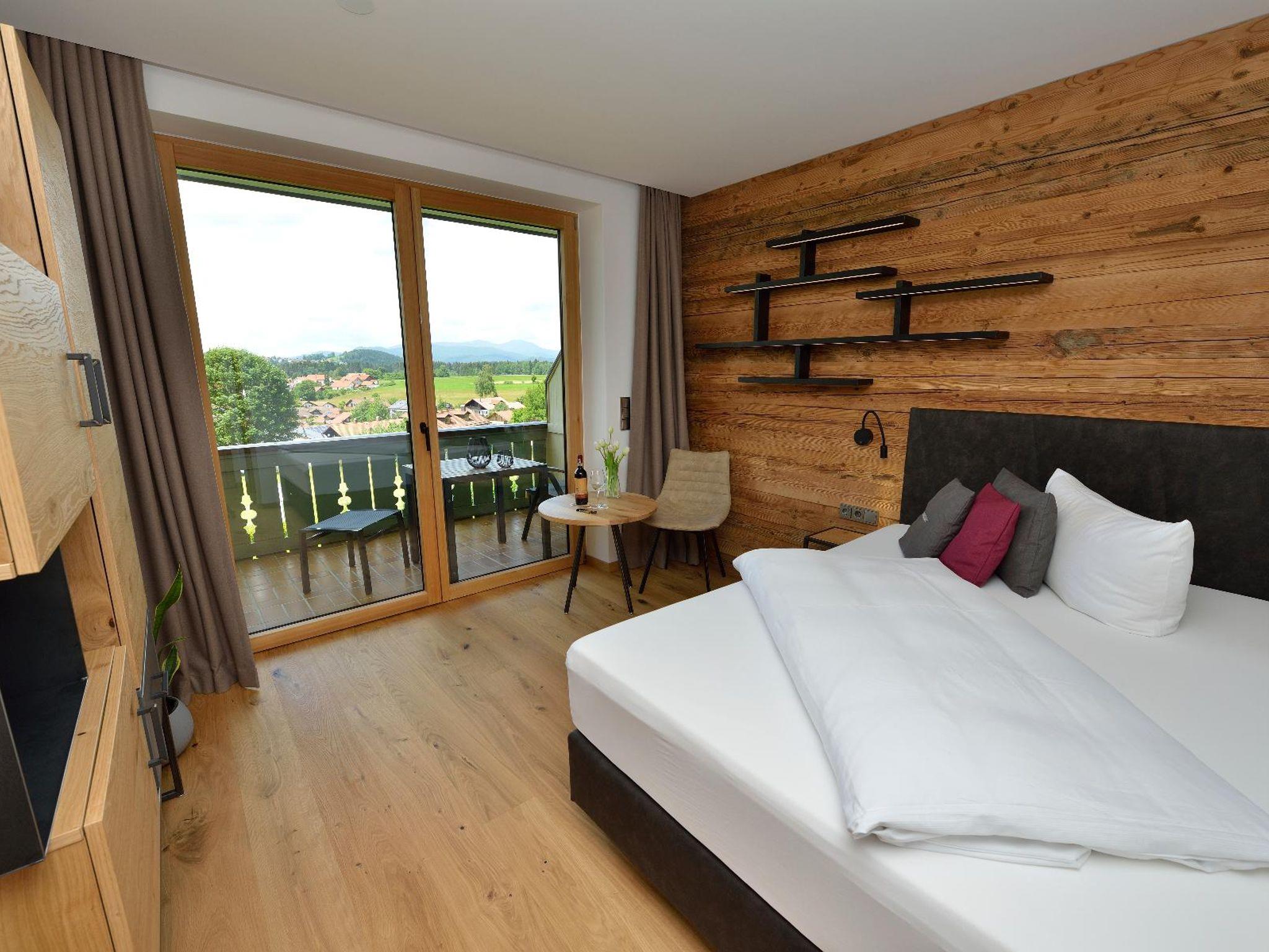 In gemütlichen, geräumigen Komfortzimmern wahlweise mit Dusche/Bad und Balkon/Terrasse ausgestattet in warmen Farben genießen Sie den Blick auf den Arber und die Wiesen und Wälder des Flanitztals.