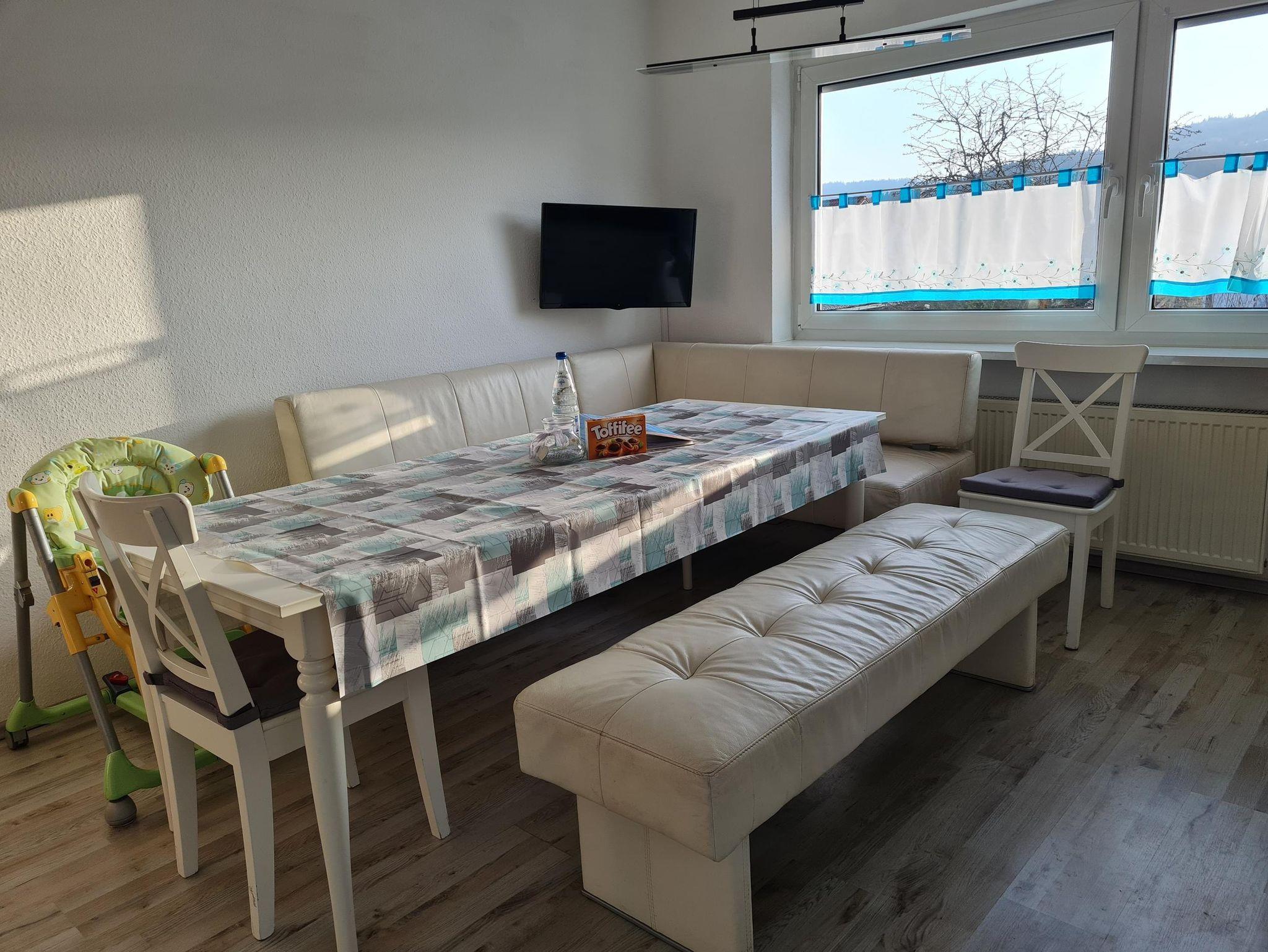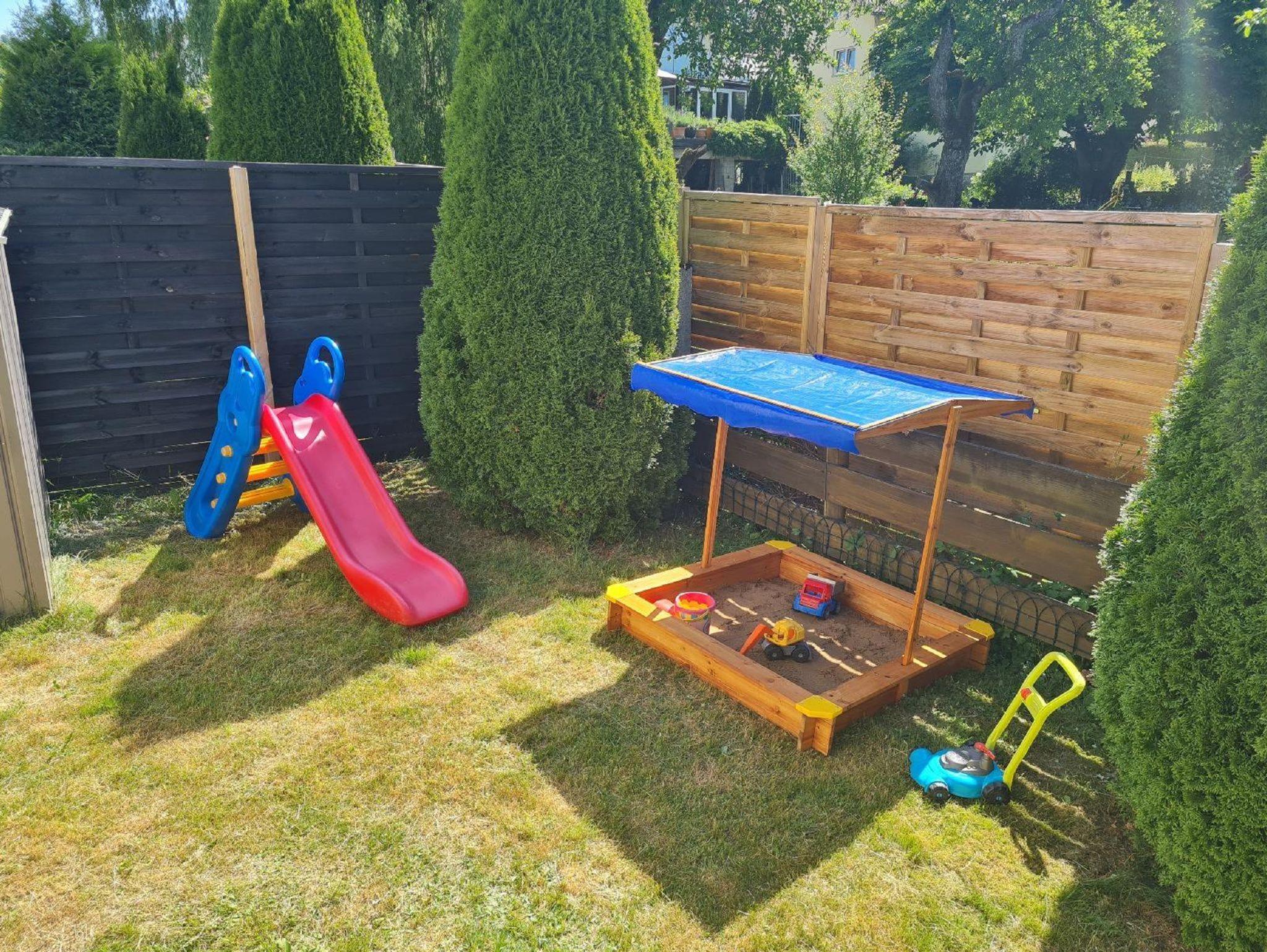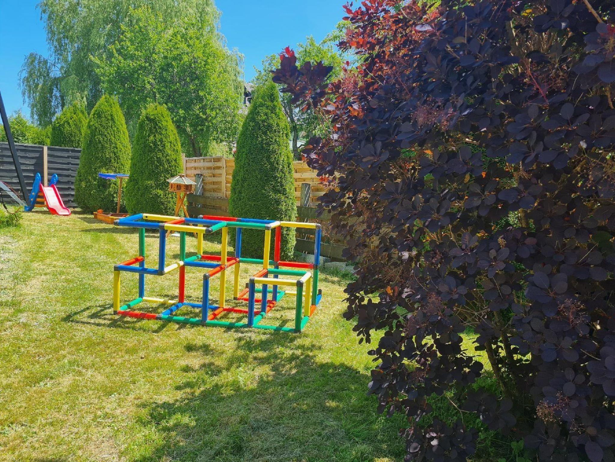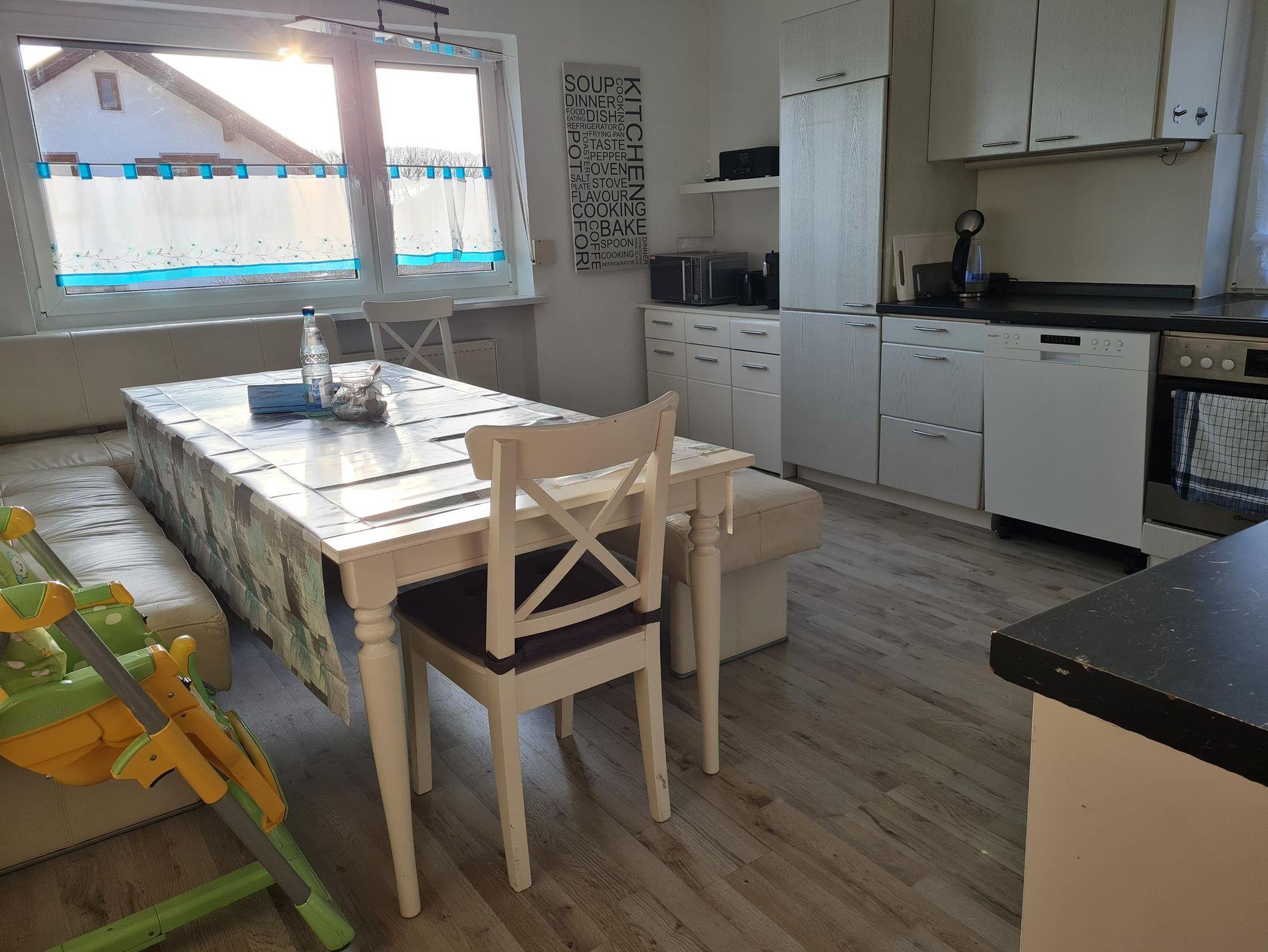 Die gemütliche Ferienwohnung befindet sich im Erdgeschoss des Hauses und bietet auf 70 Quadratmetern Platz für bis zu 5 Personen. Bitte beachten Sie, dass sie nicht barrierefrei ist, da einige Stufen zu bewältigen sind. Das Herzstück ist die voll ausgestattete Küche mit integriertem Essbereich, in der Sie alles finden, was Sie für die Zubereitung Ihrer Mahlzeiten benötigen. Das Schlafzimmer verfügt über ein komfortables Doppelbett (1,80 x 2,00 m) sowie zwei Kinderbetten (je 0,70 x 1,40 m). Im großzügigen Wohn- und Schlafbereich befindet sich eine Ausziehcouch mit Matratze (1,80 x 2,00 m) für zwei Personen sowie eine weitere Couch, die sich ebenfalls ausziehen lässt – allerdings ist diese ausgezogen eher für den Notfall geeignet, da sie weniger komfortabel ist. Eine kleine Kinderspielecke sorgt auch an Regentagen für Unterhaltung der Kleinen. Das Badezimmer ist mit Waschbecken, Badewanne und WC ausgestattet. Im Außenbereich erwartet Sie eine Terrasse mit Sitzmöbeln für bis zu sechs Personen sowie ein eigener Gartenanteil, der ideal für Familien mit Kindern ist. Hier finden die Kleinen eine Kinderrutsche, einen Sandkasten sowie Rutschfahrzeuge, mit denen sie sich austoben können. Auch Hunde sind herzlich willkommen: Auf Wunsch stellen wir gerne ein Hundebett, Napf sowie etwas Hundespielzeug zur Verfügung – so fühlen sich auch die Vierbeiner wohl. Die Ferienwohnung ist ideal für Familien mit Kindern und/oder Hund und bietet eine charmante Mischung aus Komfort, Funktionalität und naturnahem Freizeitspaß.