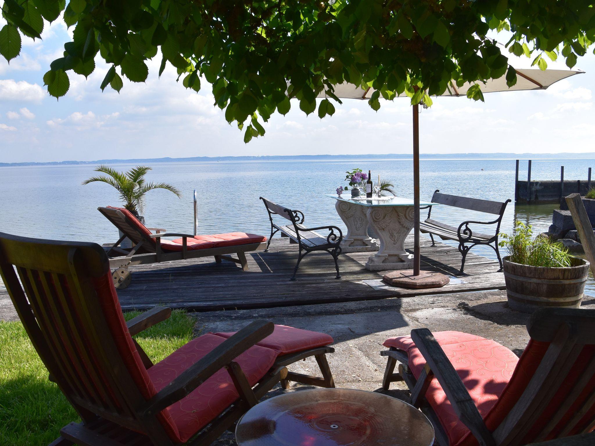 Baden am See: Zum Haus gehört ein privater Badestrand mit Liegestühlen und Seezugang mit Badeleiter - nur 50 Meter vom Haus enfernt.