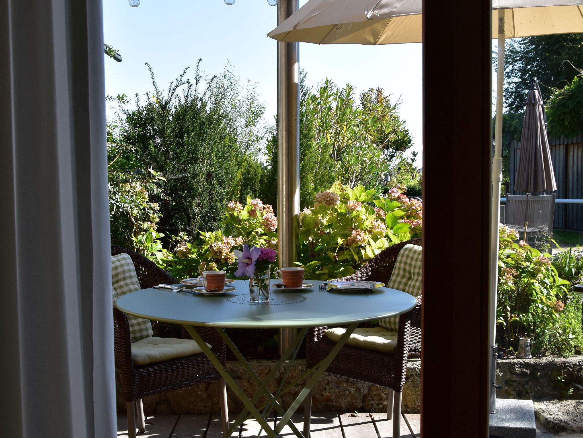 Die Ferienwohnung Inselglück besteht aus einem großen hellen Wohnraum mit gemütlichen Kachelofen und einer Küchenzeile, einem Schlafzimmer und einem Bad. Zur wohnung gehört eine überdachte Blumenterasse, von der aus der Garten erreichbar ist. Am See befindet sich ein Sitzplatz für ein romantisches Abendessen oder ein Gläschen Wein.