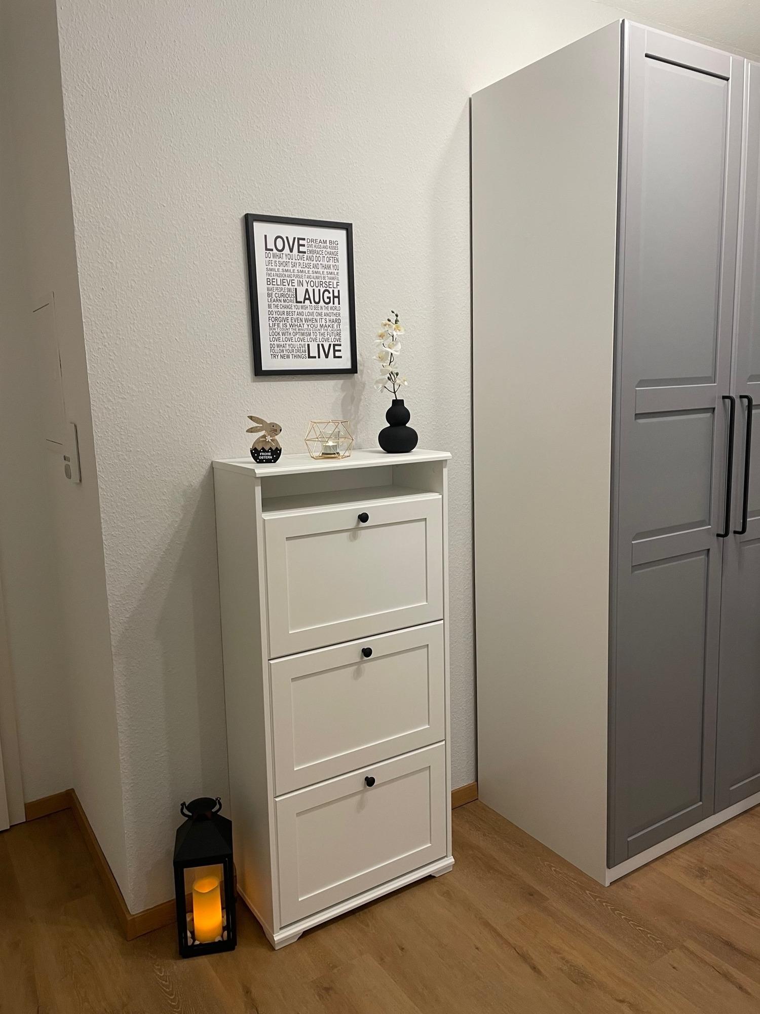 Sie verfügt über eine voll ausgestattete Küche mit Bartisch und zwei Hockern; Flachbild -Sat TV mit großem Esstisch und ausziehbarer Couch im Wohnzimmer; Doppelbett mit Bettwäsche im Schlafzimmer sowie ein eigenes Bad mit Glasdusche, Badewanne, Haartrockner und Handtüchern. Ein großer Kleiderschrank im Flur bietet genügend Stauraum. Zwei Räume verfügen über Außenrollläden. Im Badezimmer befinden sich zwei Doppelrollos an den dreifach-verglasten Fenstern und das Schlafzimmer ist ausgestattet mit einem Außenrollladen am Fenster und zwei Verdunklungsvorhängen an der Balkontür.