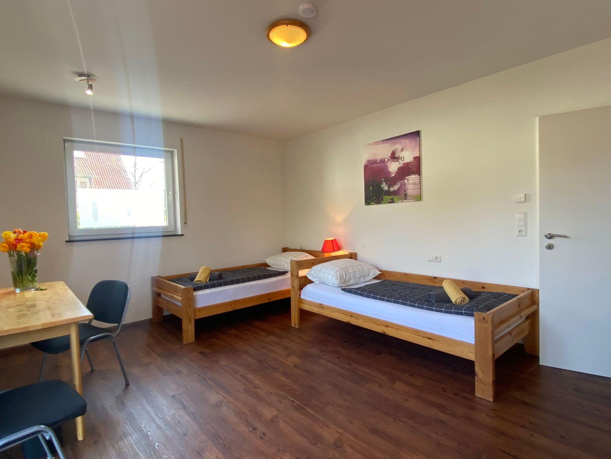 Großes Nichtraucher-Gästezimmer , ruhig und hell. Ausgestattet ist es mit zwei Einzelbetten, Kleiderschrank, Schreibtisch, WLAN, Bügelbrett, so dass auch 3 Leute Platz fänden. Das private Badezimmer hat eine Dusche auf der Etage. Die Betten sind frisch bezogen. Außerdem gibt es Handtücher, Geschirr und Besteck, Kaffeemaschine und Wasserkocher sind unten in der Küche, die man zusammen nützen kann.