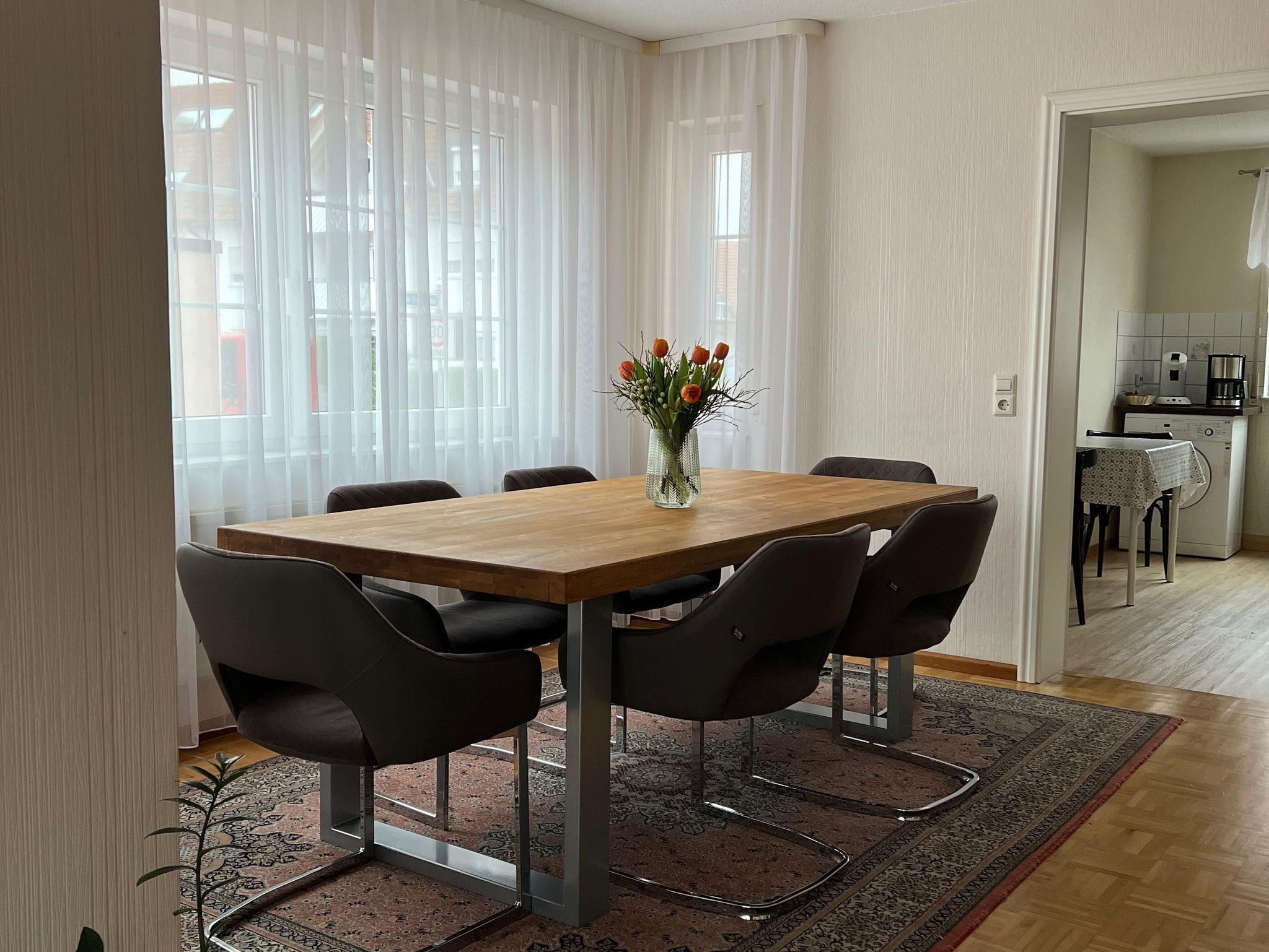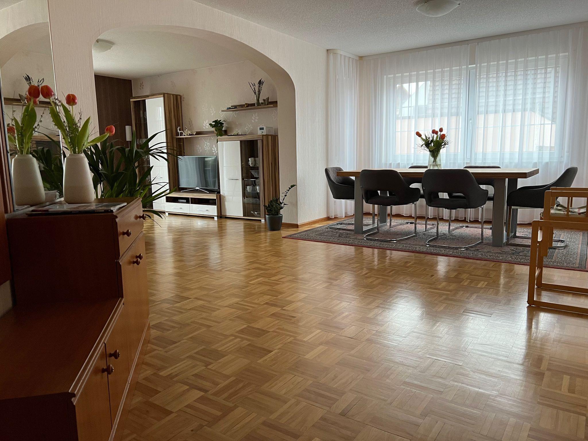 Die 80qm große 3- Zimmer-Ferienwohnung befindet sich im Erdgeschoss eines Zwei-Familien-Hauses. Das Haus liegt im Freiburger Ortsteil Hochdorf und steht an einer verkehrsberuhigten Straße. Die Wohnung ist hell und freundlich eingerichtet und bietet viel Platz für 5 Personen. Sie verfügt über eine große Terasse zur Südseite. Die Küche ist komplett und funktionell eingerichtet. Direkt gegenüber hält der Bus, der im 20- Minuten Takt in Richtung Stadtmitte fährt. Die S-Bahn Haltestelle befindet sich in ca. 1 Km Entfernung. Es sind zwei Badeseen (Tunisee und Silbersee) in der Nähe vorhanden.