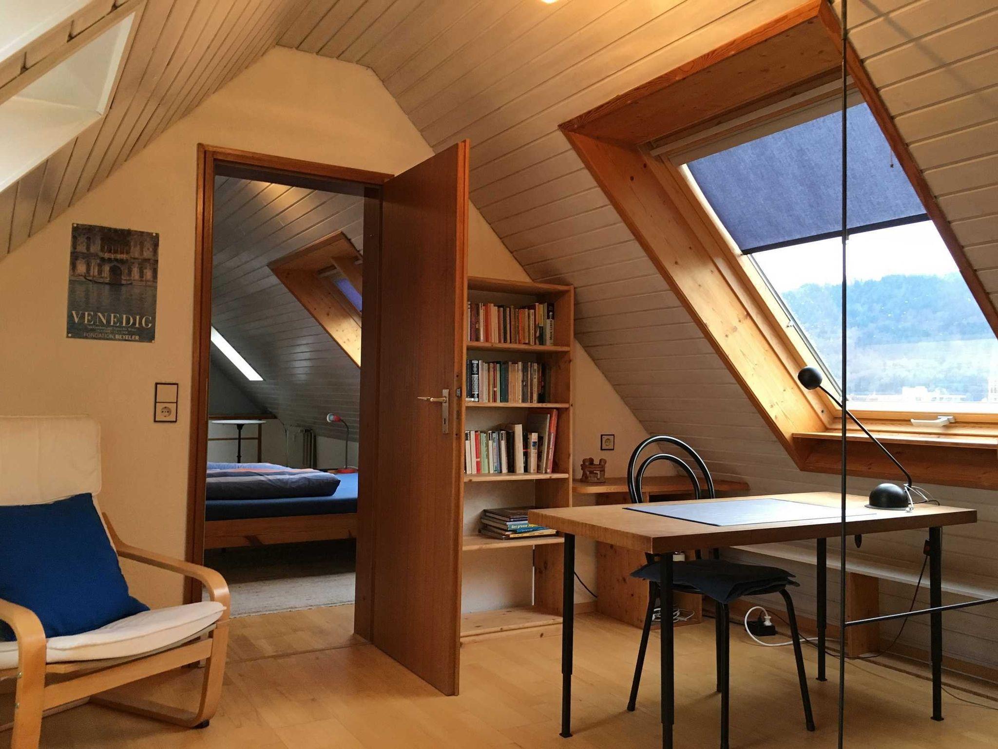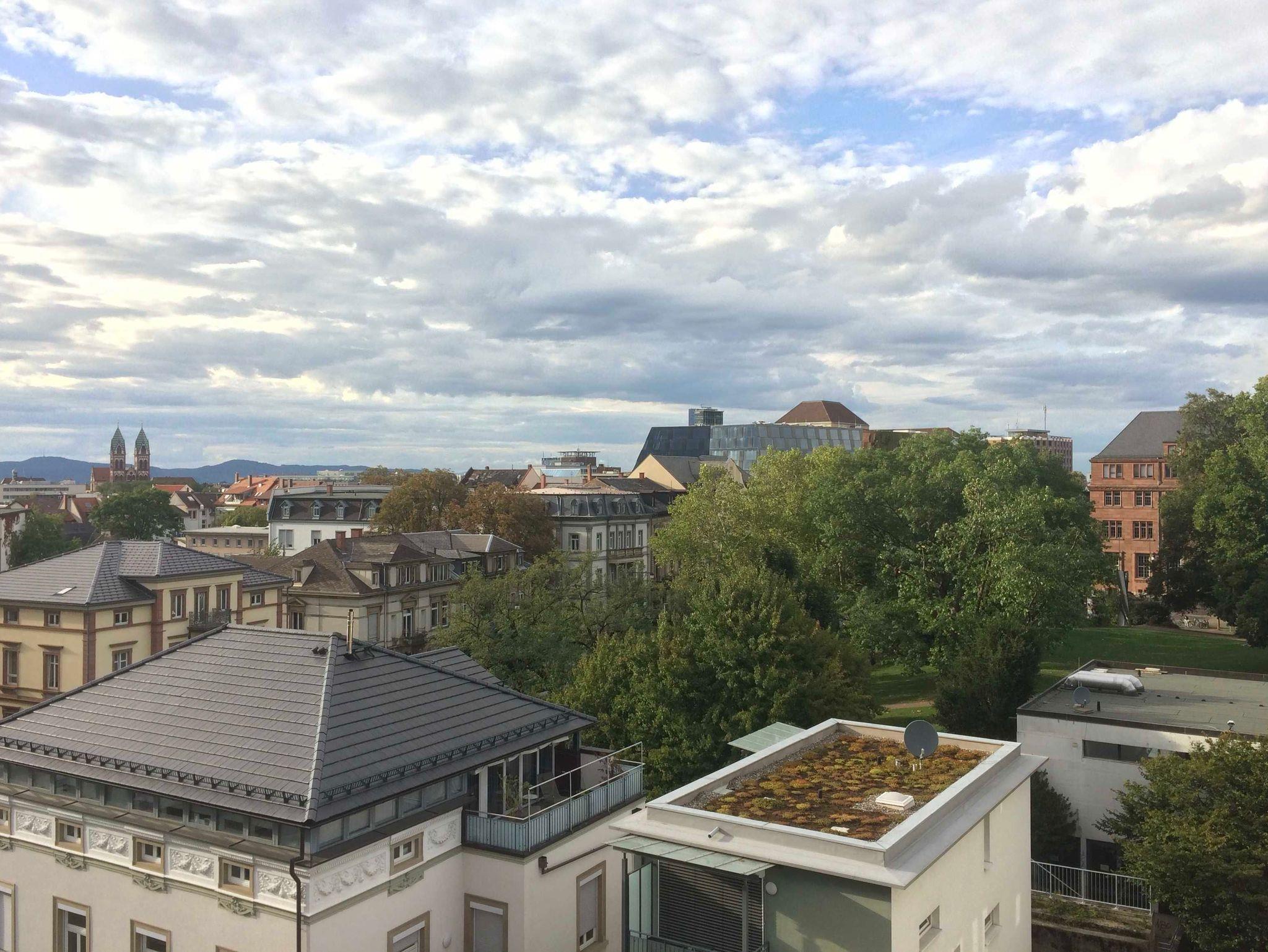 Über den Dächern und im Zentrum Freiburgs gelegene, ruhige und helle Drei-Zimmer-Maisonettewohnung mit Südterrasse. Ein Lift führt in den 5.Stock. Esszimmer, kleine Küche, Bad/WC im unteren Wohnbereich sowie Wohn/Arbeits - und Schlafzimmer im Dachgeschoss. Hinweis für Kinder und ältere Personen: relativ steile Treppe (siehe Foto). TV, Internet, Radio und Schreibtisch vorhanden. Ein Doppelbett mit getrennten Matratzen befindet sich im Schlafzimmer, eine Schlafcoach im Wohnzimmer. Ein mediterranes Lebensgefühl genießen Sie an warmen Abenden auf der großen Dachterasse, von der Sie einen freien Blick auf Schönberg, Sternwald und Schauinsland haben. Parkplatz im Hinterhof kann dazu gemietet werden.