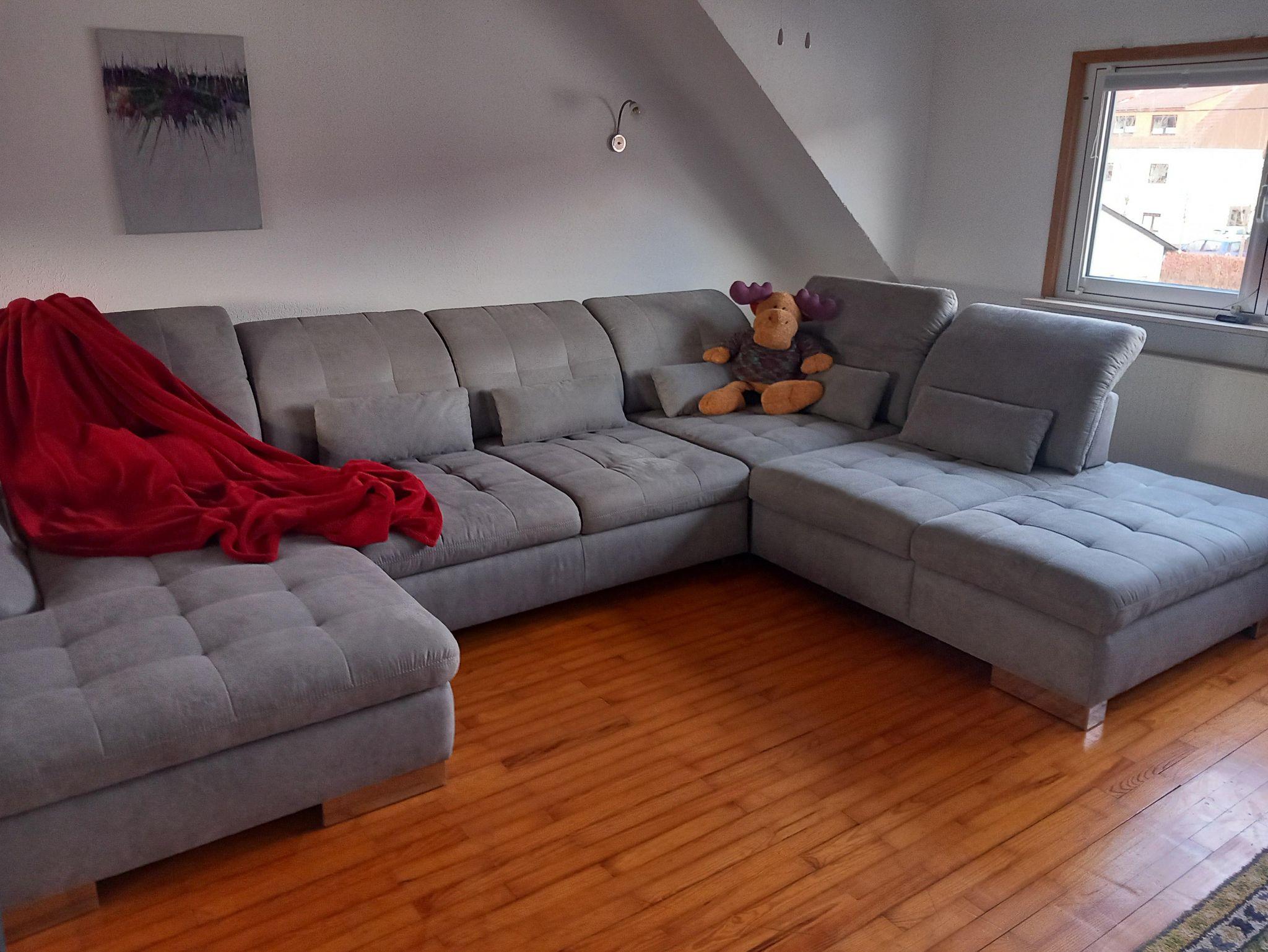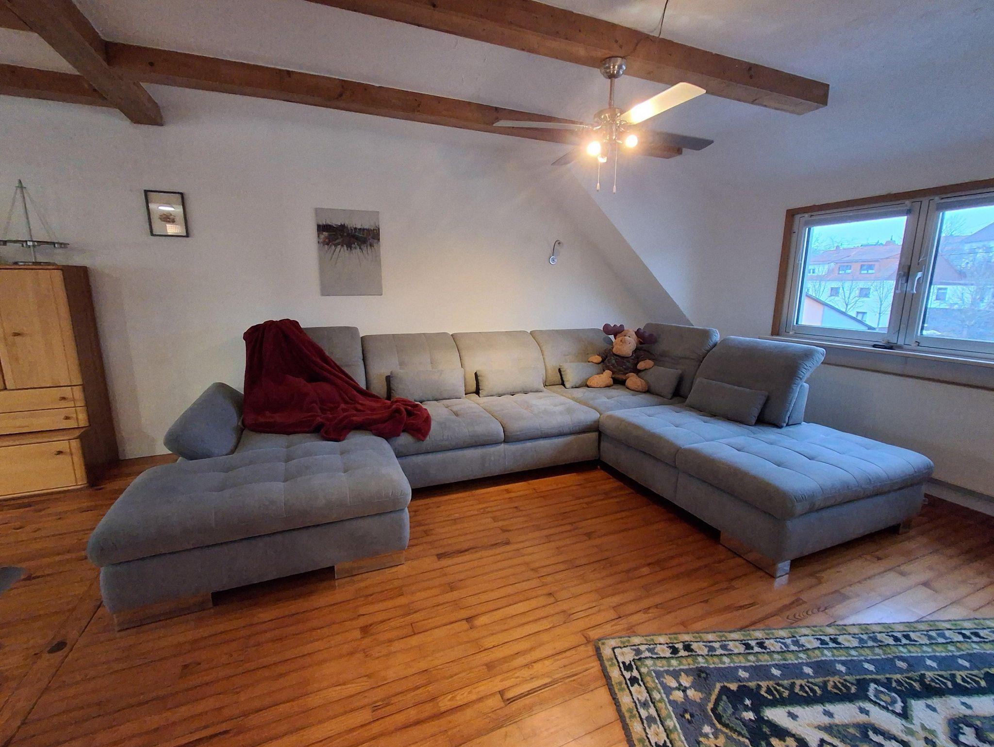 Der helle Wohnraum punktet mit großen Fenstern und Rollos, einer riesigen, bequemen Schlafcouch sowie einem großen Fernseher – ideal für entspannte Abende. Ein Deckenventilator sorgt auch an warmen Tagen für ein angenehmes Raumklima.