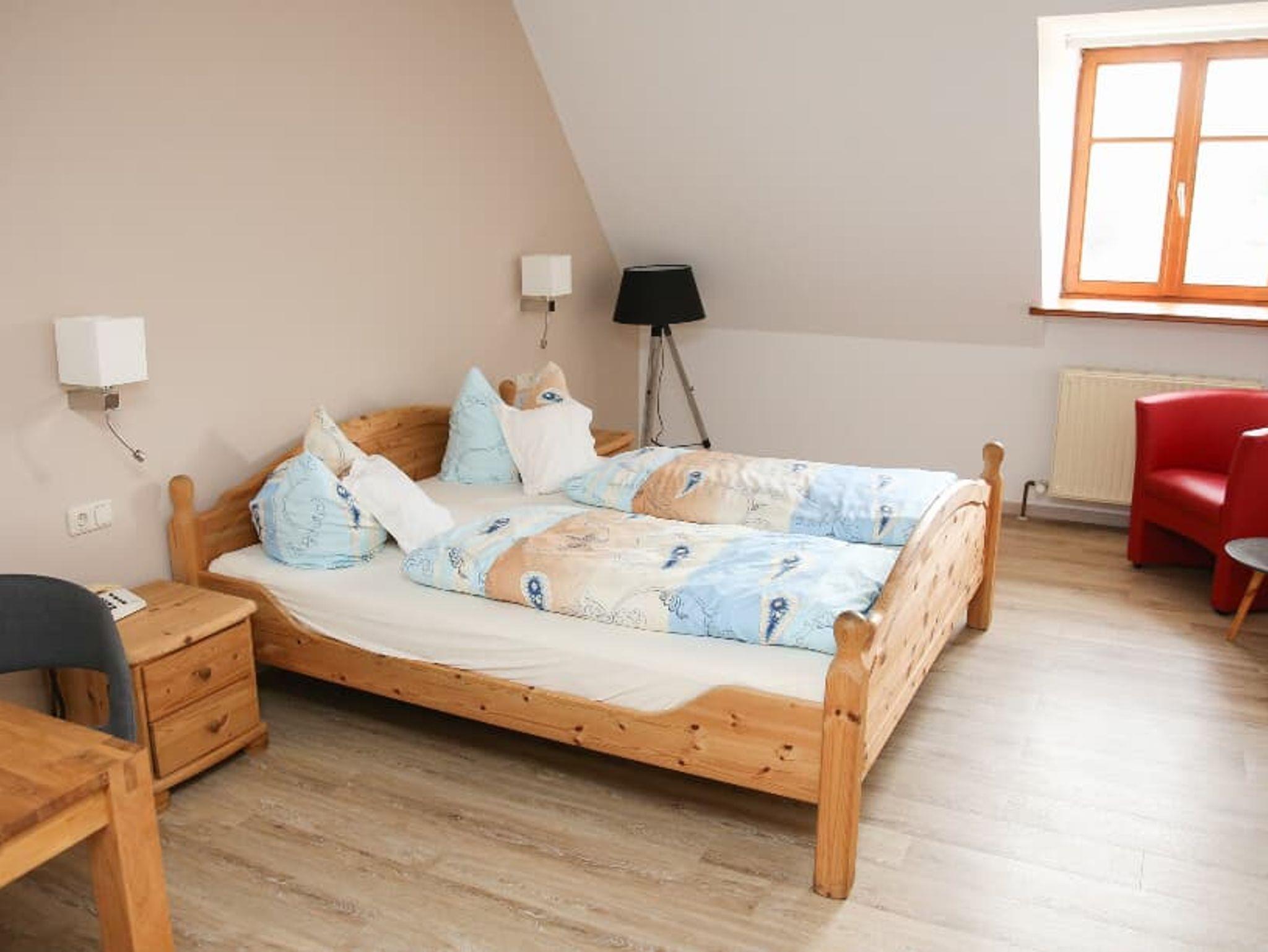 Das im Landhausstil eingerichtete Zimmer bietet auf 24 Quadratmetern Platz für bis zu 2 Personen. Das helle Zimmer ist ausgestattet mit einem Doppelbett,Schrank, Schreibtisch, Sitzgelegenheit, Beistelltisch sowie Full-HD-LED-TV, Zimmersafe. Das Badezimmer verfügt über Dusche, WC, Waschbecken und Föhn. WLAN und Parkplatz sind im Preis inkludiert.