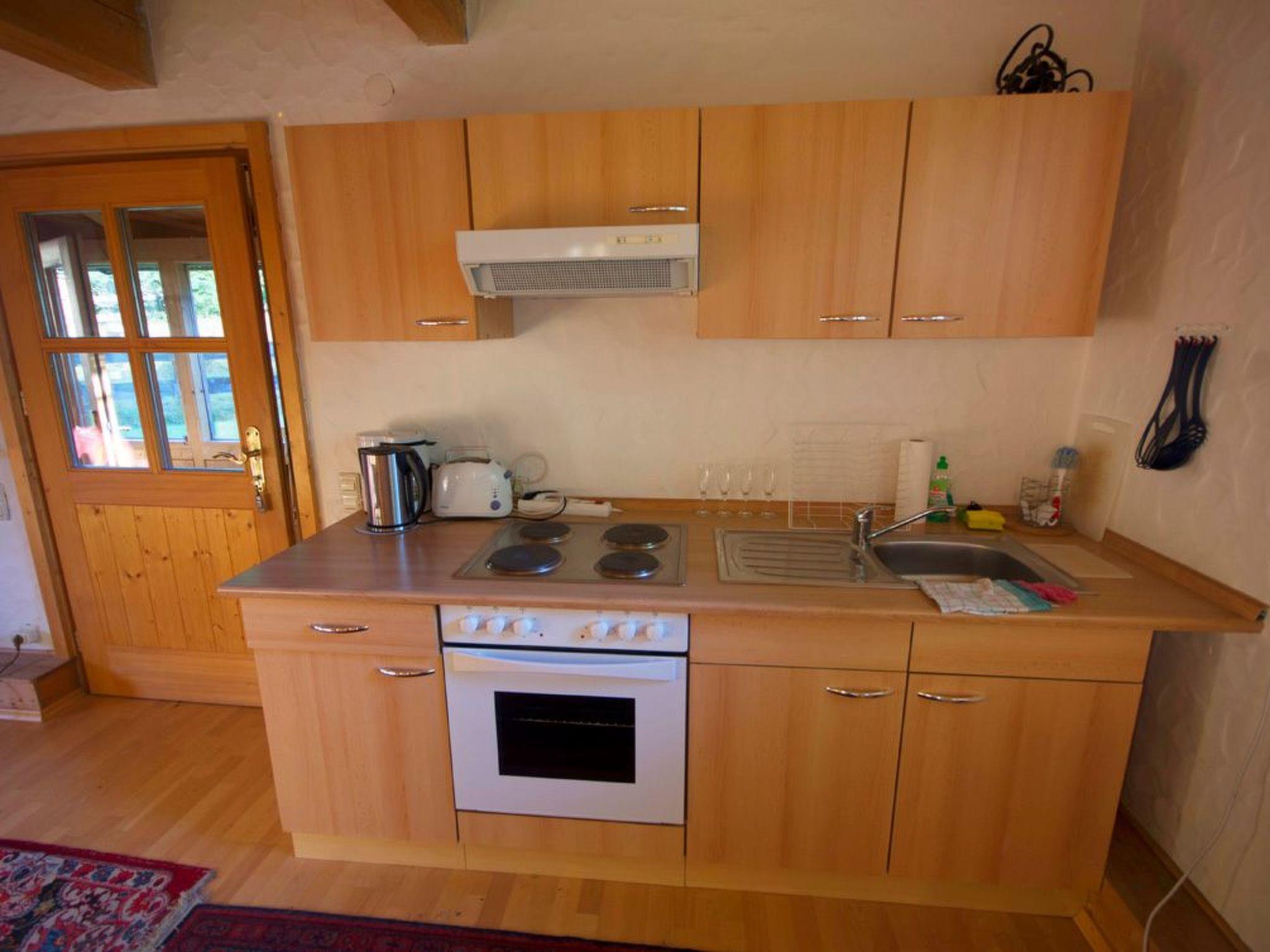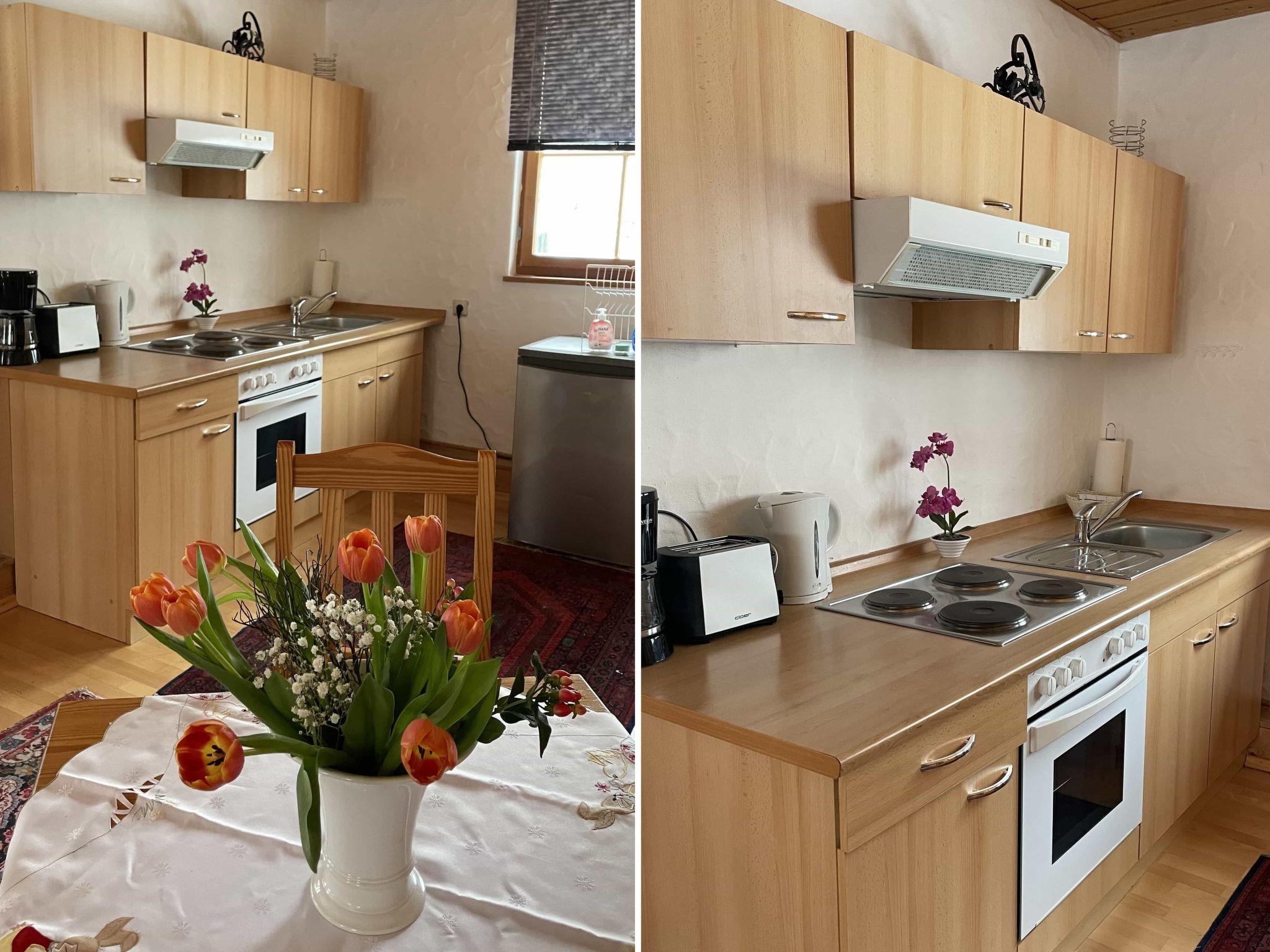 The lovingly furnished holiday flat offers many opportunities for relaxation and socialising. The entrance to the approx. 50m² holiday flat is on the ground floor of the house and offers space for two to three people. In the open-plan living, dining and cooking area you will find a fully equipped kitchenette. In addition to all the important kitchen utensils, there is also a toaster, a kettle, an electric hob and an oven. The dining table not only invites you to eat together but also to socialise. In the adjoining living area, a sofa corner with a TV invites you to linger. The sofa can also be used as a sofa bed (185cm x 125cm). A staircase takes you to the first floor, where you will find the cosy bedroom with a double bed. The shower room with hairdryer and WC completes the offer.