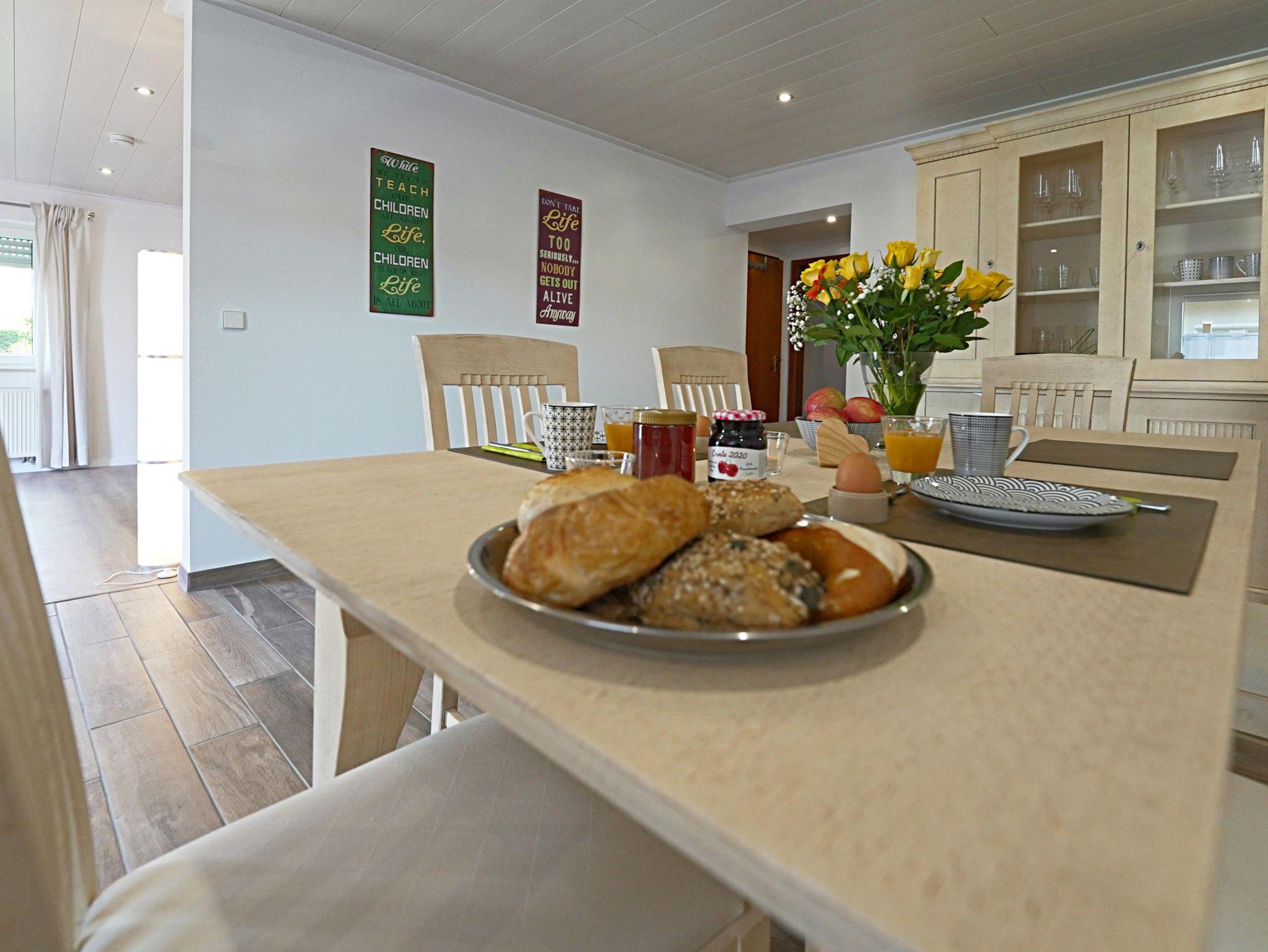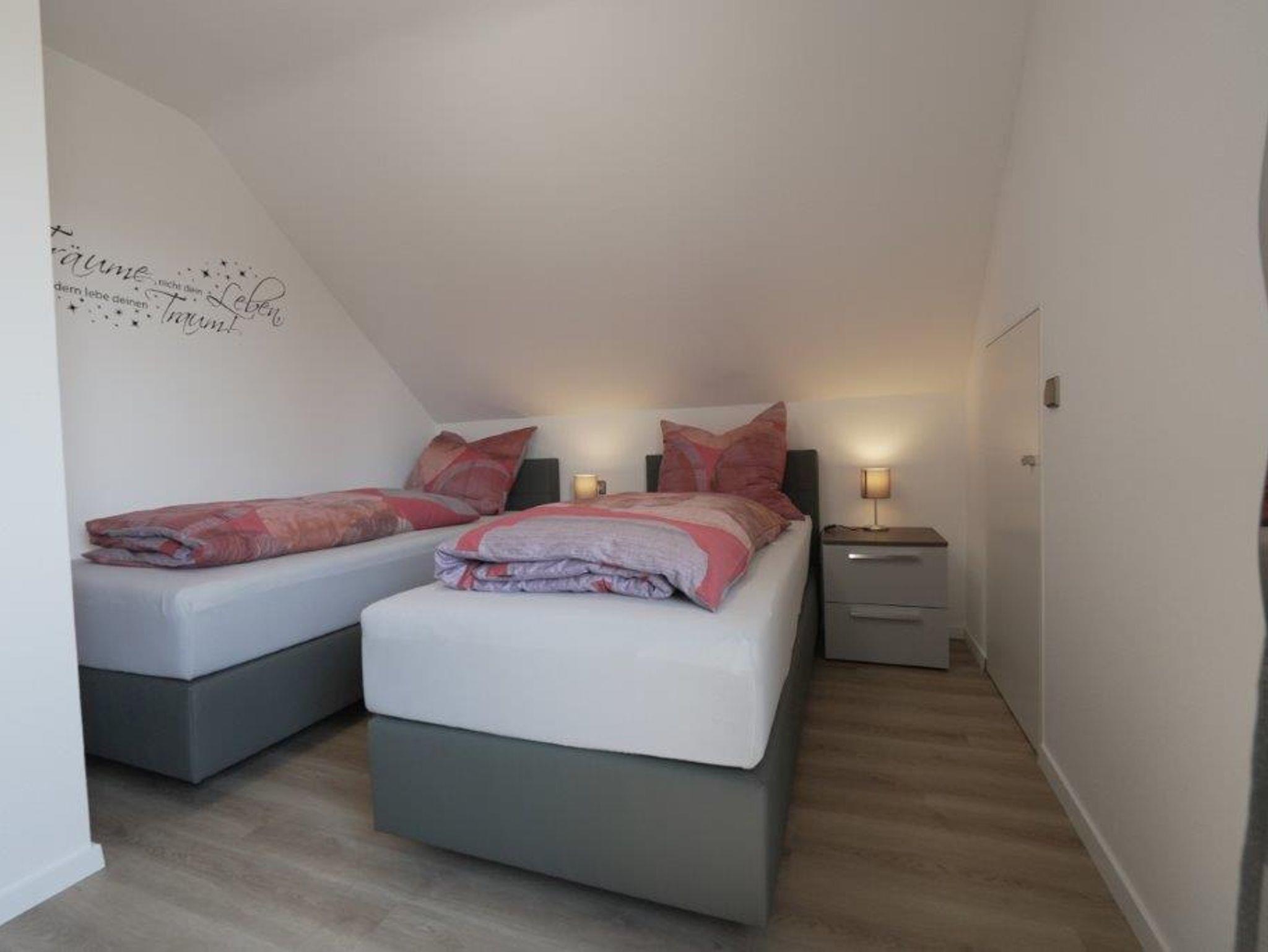 Aufteilung : Diele, Esszimmer mit Küchenzeile, Wohnzimmer mit Schlafcouch, 1 Schlafzimmer mit Boxspring-Doppelbett 180x200, 1 Schlafzimmer mit Boxspring-Einzelbetten 90x200, bei Bedarf als Doppelbett nutzbar, Bad mit Dusche/WC