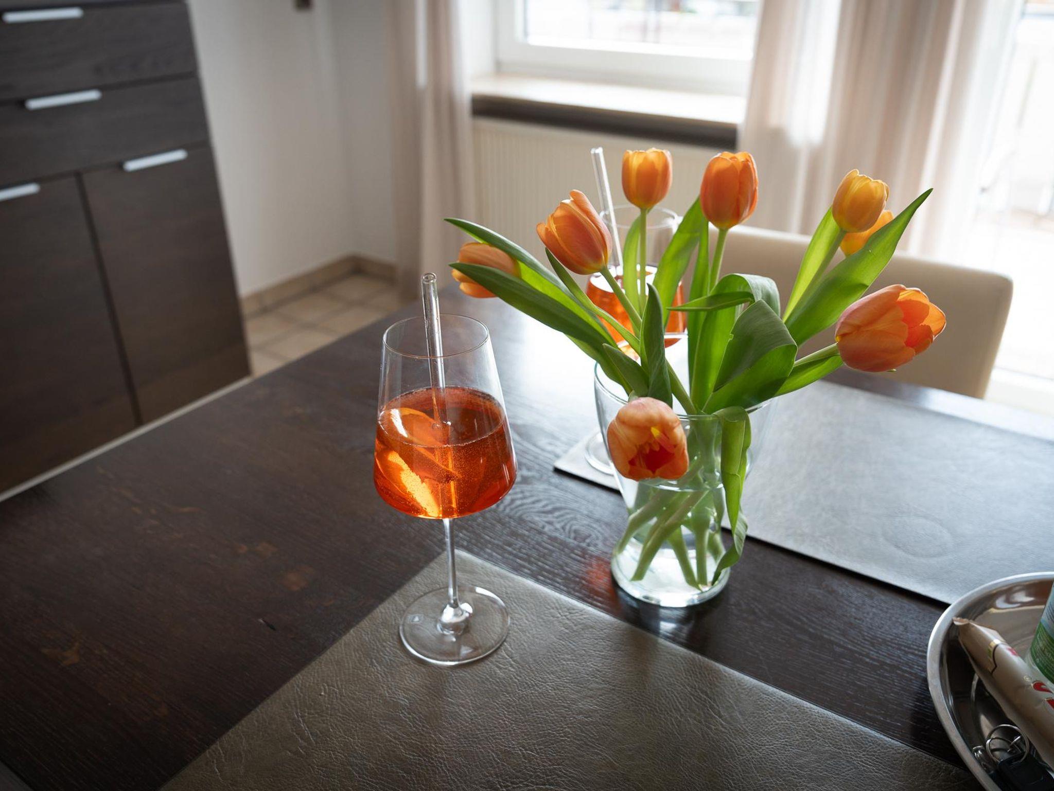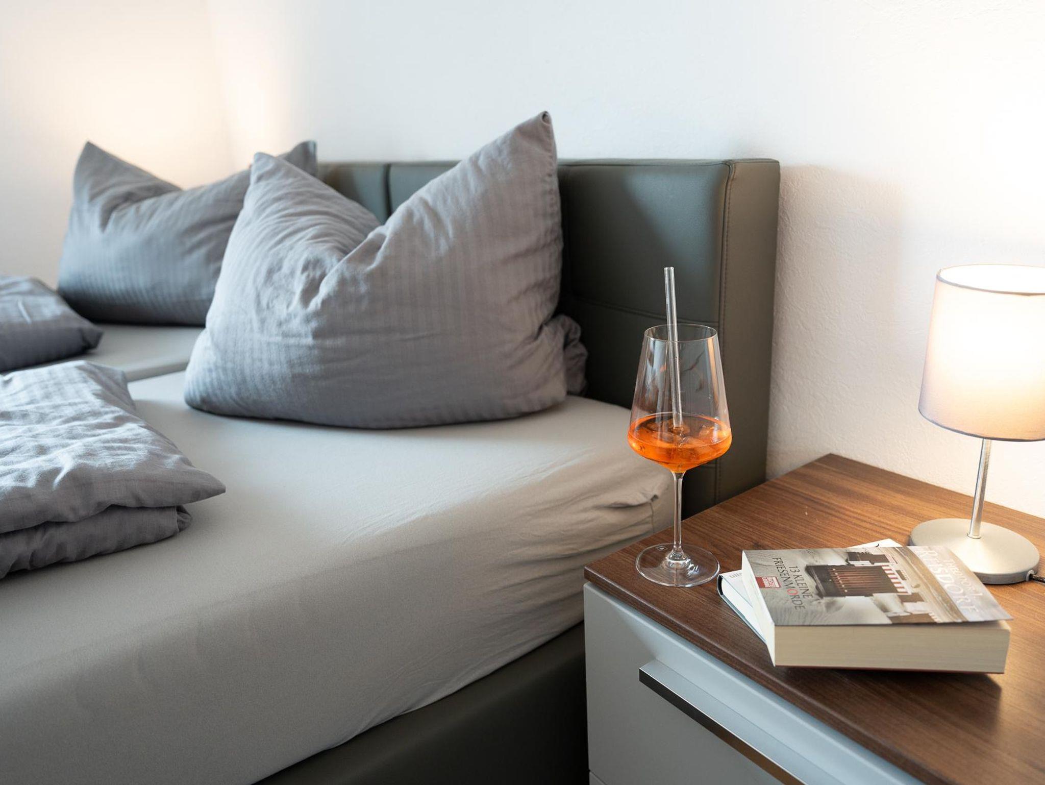 Sie betreten die Wohnung über eine großzügige Diele. Von dort gelangen sie in alle Räume. Die Wohnung hat eine Küche mit einem separaten Esszimmer. Ein Schlafzimmer ist mit einem Boxspring-Doppelbett, das andere Schlafzimmer mit zwei Boxspring-Einzelbetten ausgestattet.