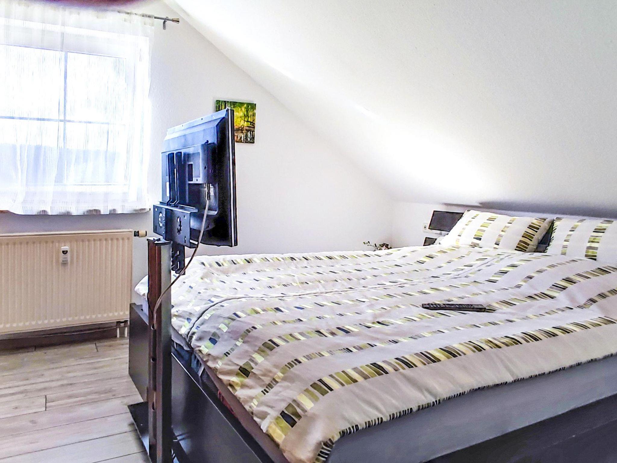 Das Doppelbett im Schlafzimmer ist 1,80 x 2,00 m groß und besitzt 2 Einzelmatratzen.