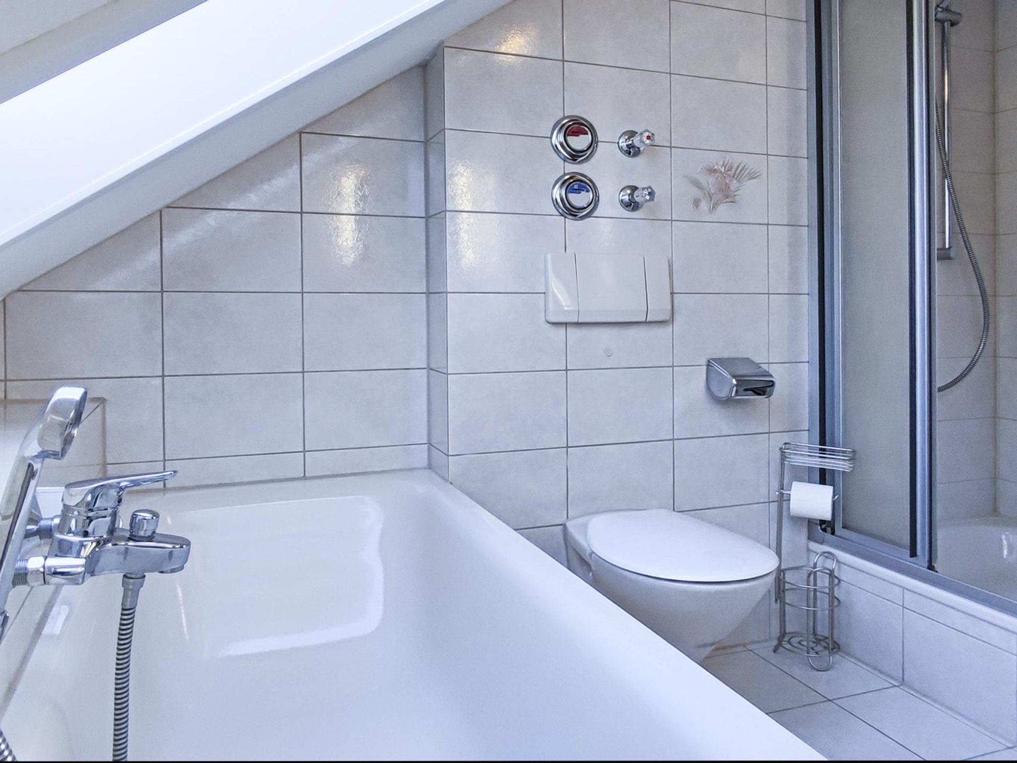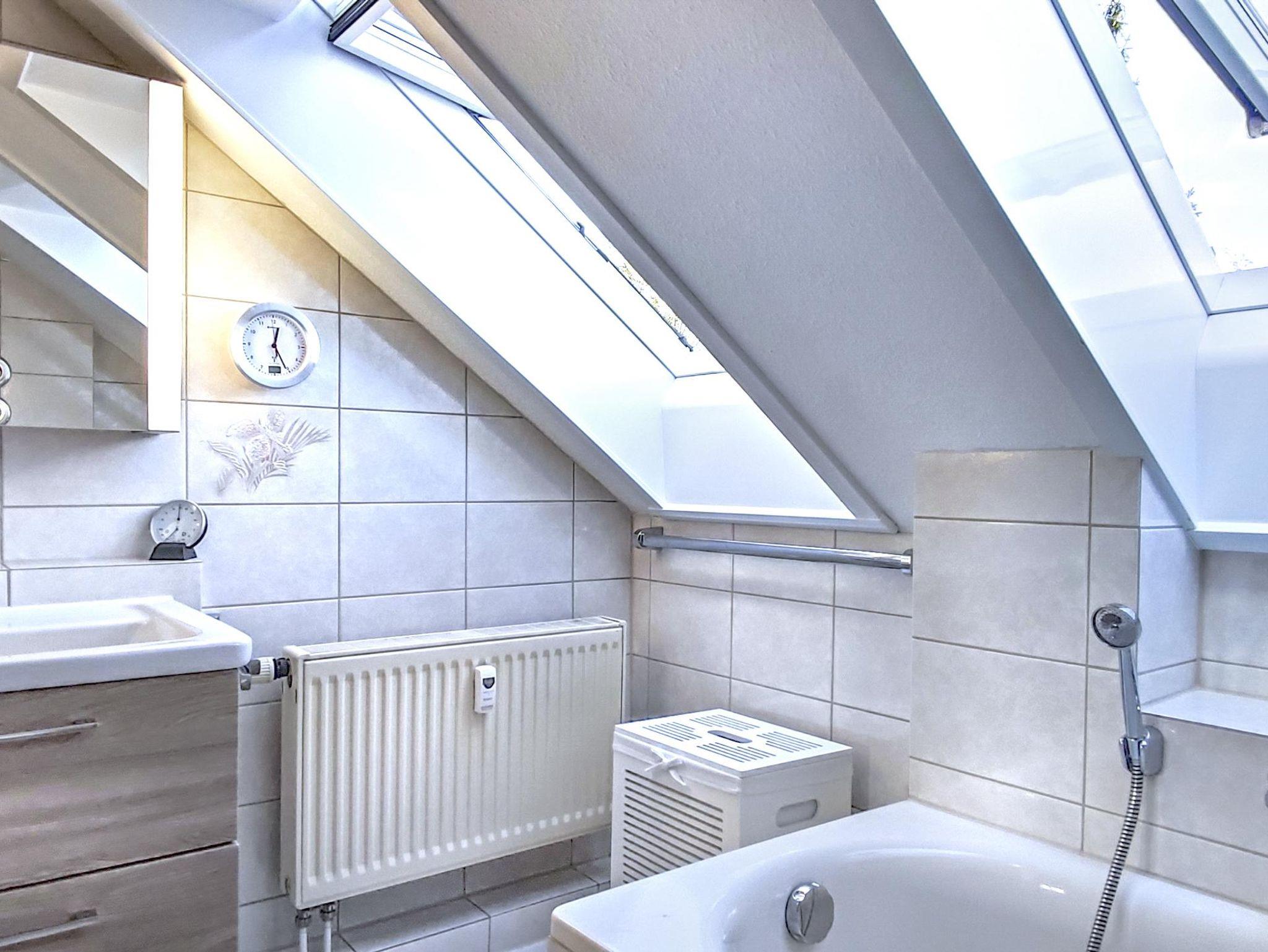 Das gemütliche Badezimmer lädt zu entspannenden Momenten in der Badewanne ein. Die Toilette besitzt eine Absenkautomatik. Natürlich ist auch ein Föhn vorhanden.