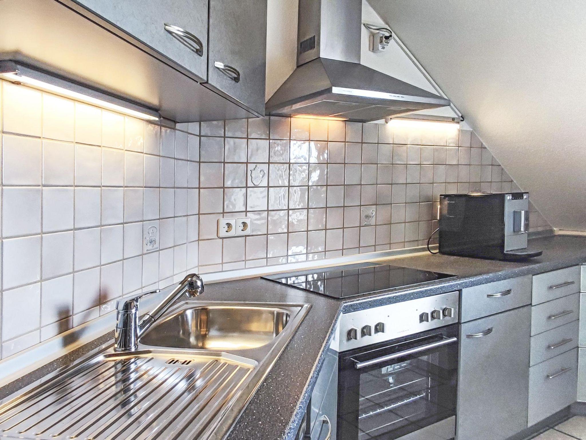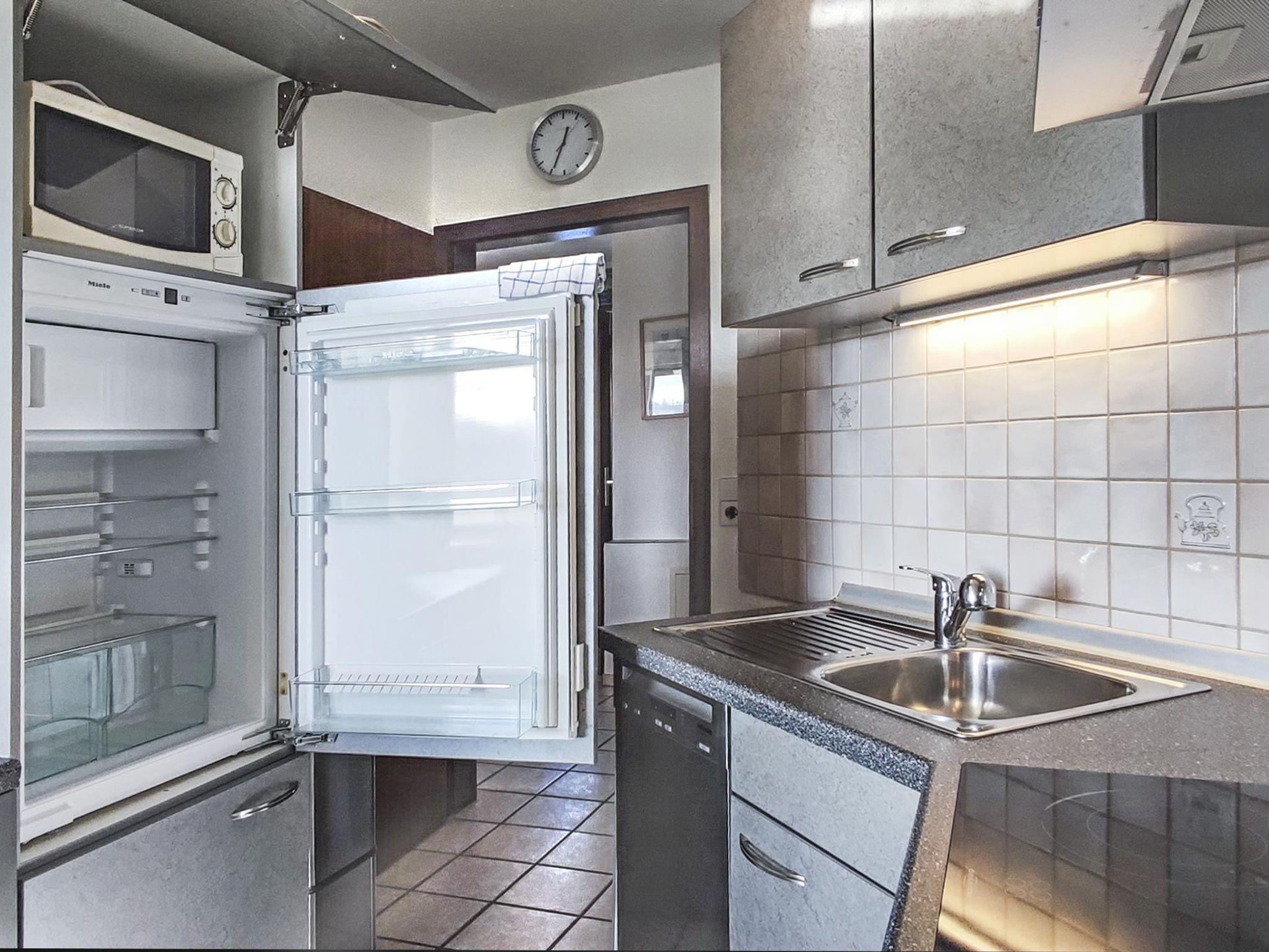Die Küche ist mit einer Miele Spülmaschine, einer Mikrowelle, einer Kühl-/Gefrierkombination, einem 4-Platten-Ceran-Kochfeld und einer Kaffeemaschine mit frischen Bohnen. Vervollständigt wird sie durch einen No-Touch-Mülleimer, Geschirr, Besteck, Kochutensilien, Töpfe, Pfannen, Toaster, Wasserkocher, Mixer und einer Grundauswahl an Gewürzen.