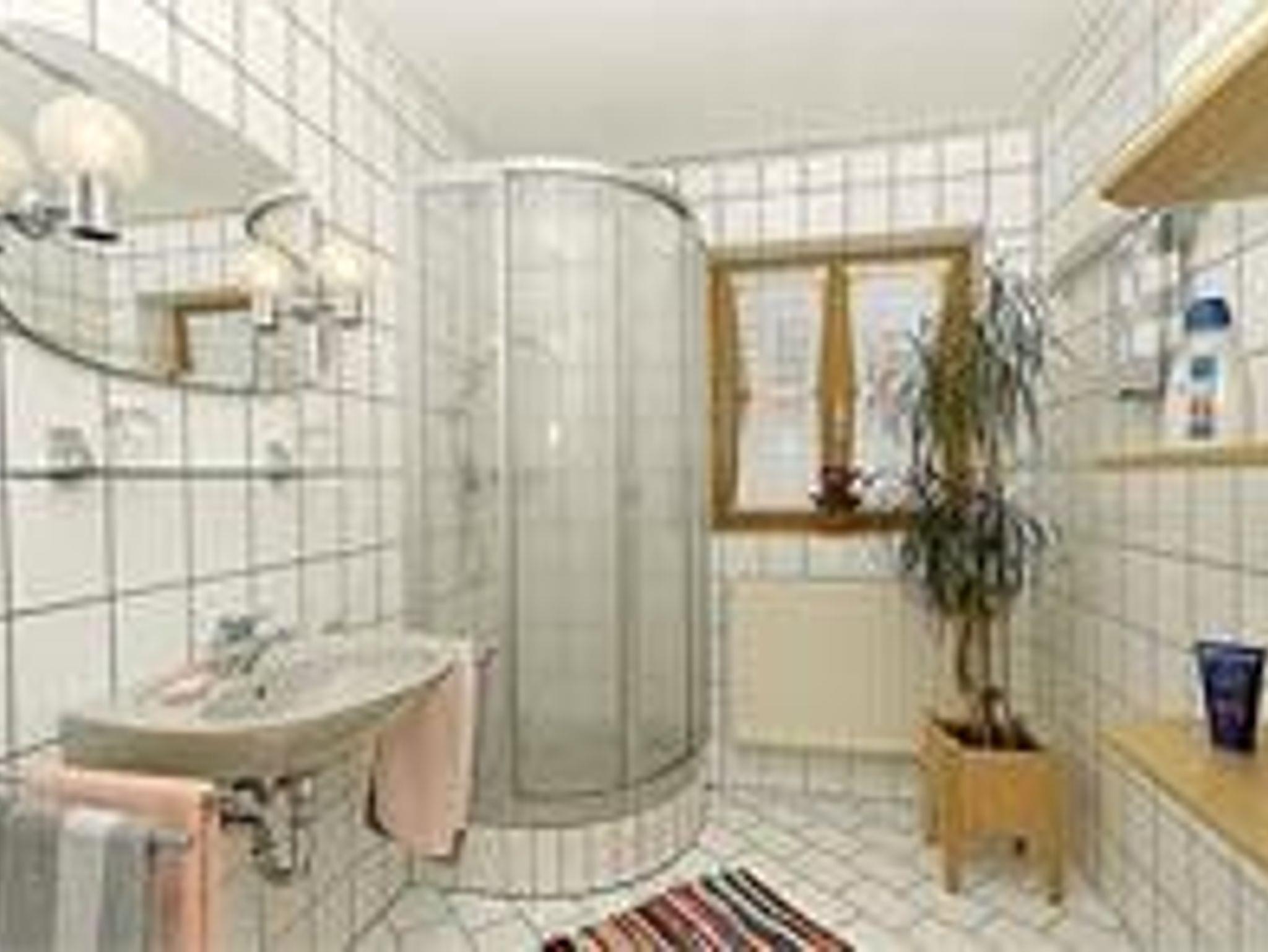 Im geräumigen Badezimmer finden Sie eine Dusche, Waschbecken, Fön, Handtücher, Duschtücher, Badeteppich und ein Schminkspiegel. Das WC befindet sich in einem extra Raum.