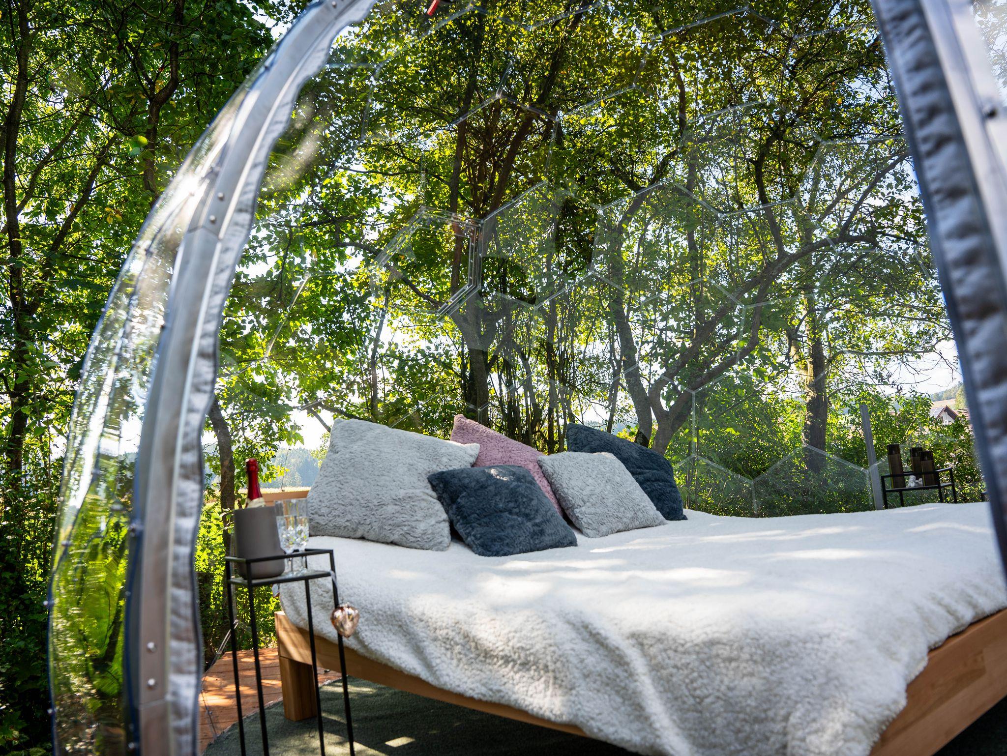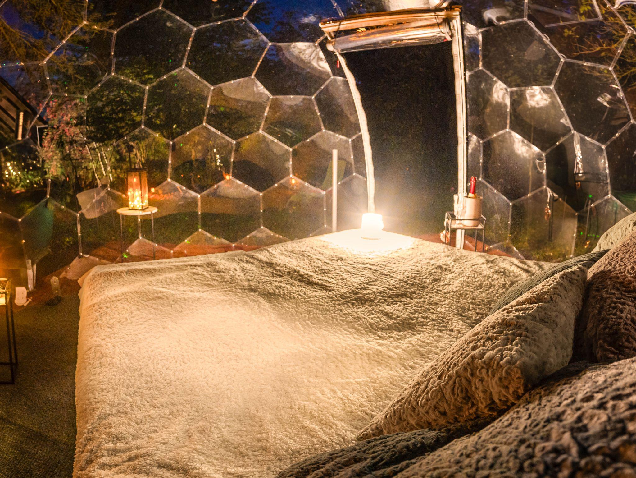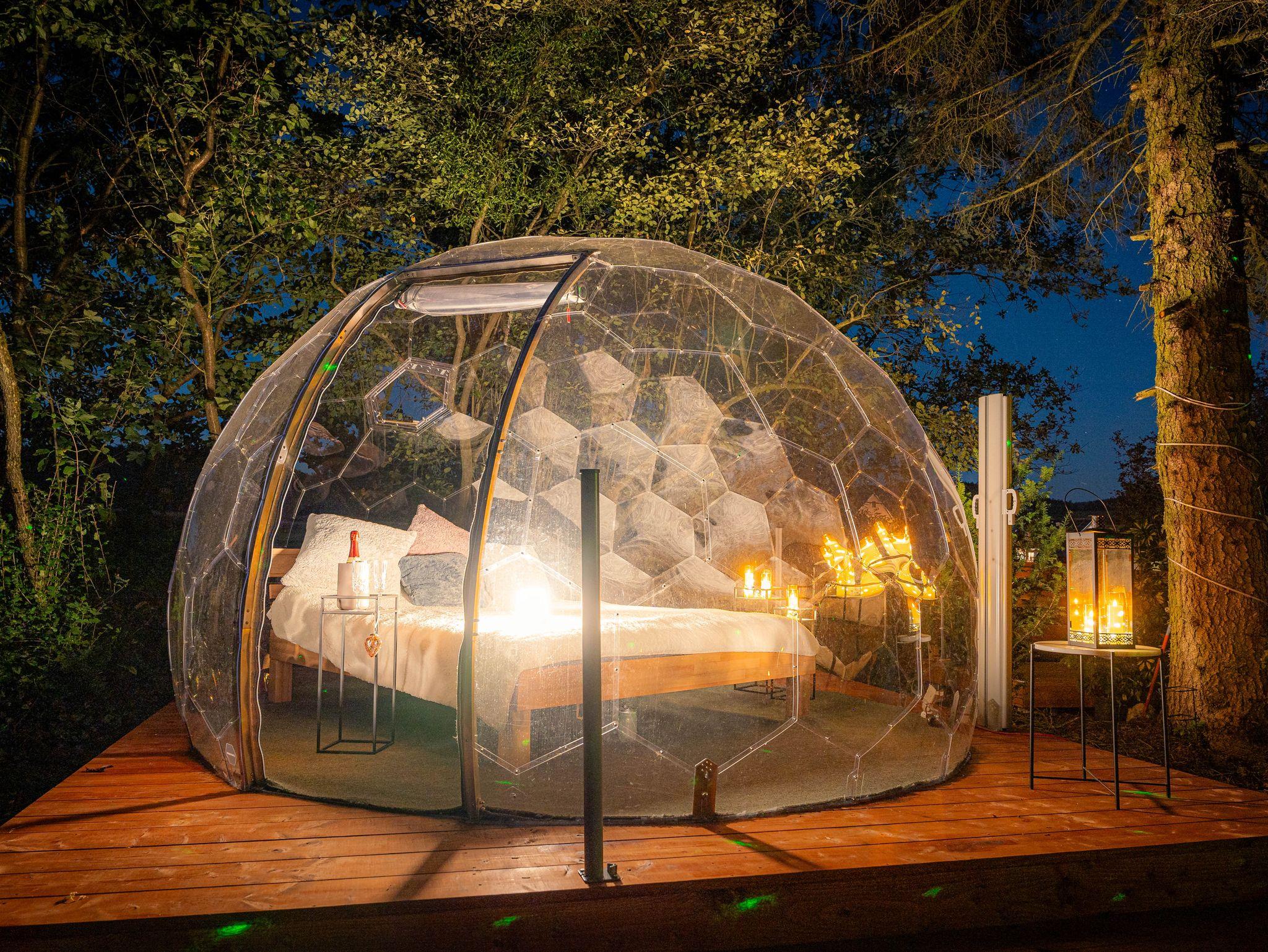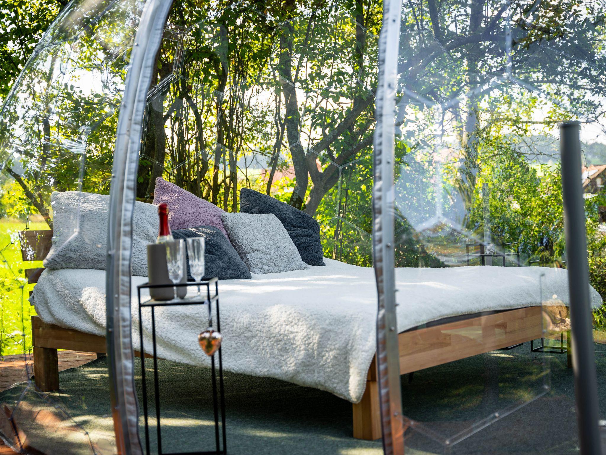 Die klare Kuppel eröffnet einen atemberaubenden Blick auf den Sternenhimmel und die umliegende Landschaft – ein perfekter Ort für Romantik,