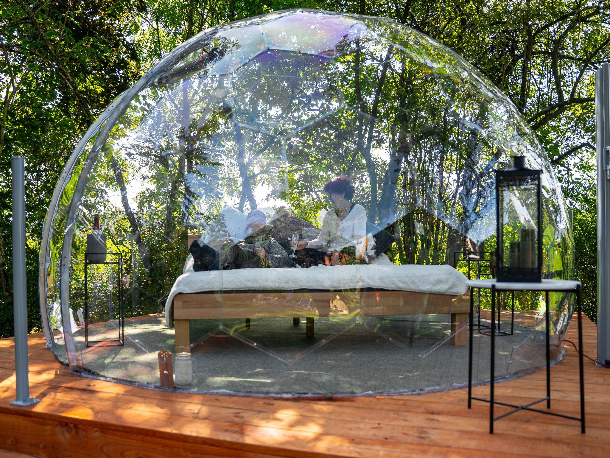 Unter einer eleganten Glaskuppel, die inmitten des großen Gartens des Gästehauses steht, genießen Gäste die Magie der Natur