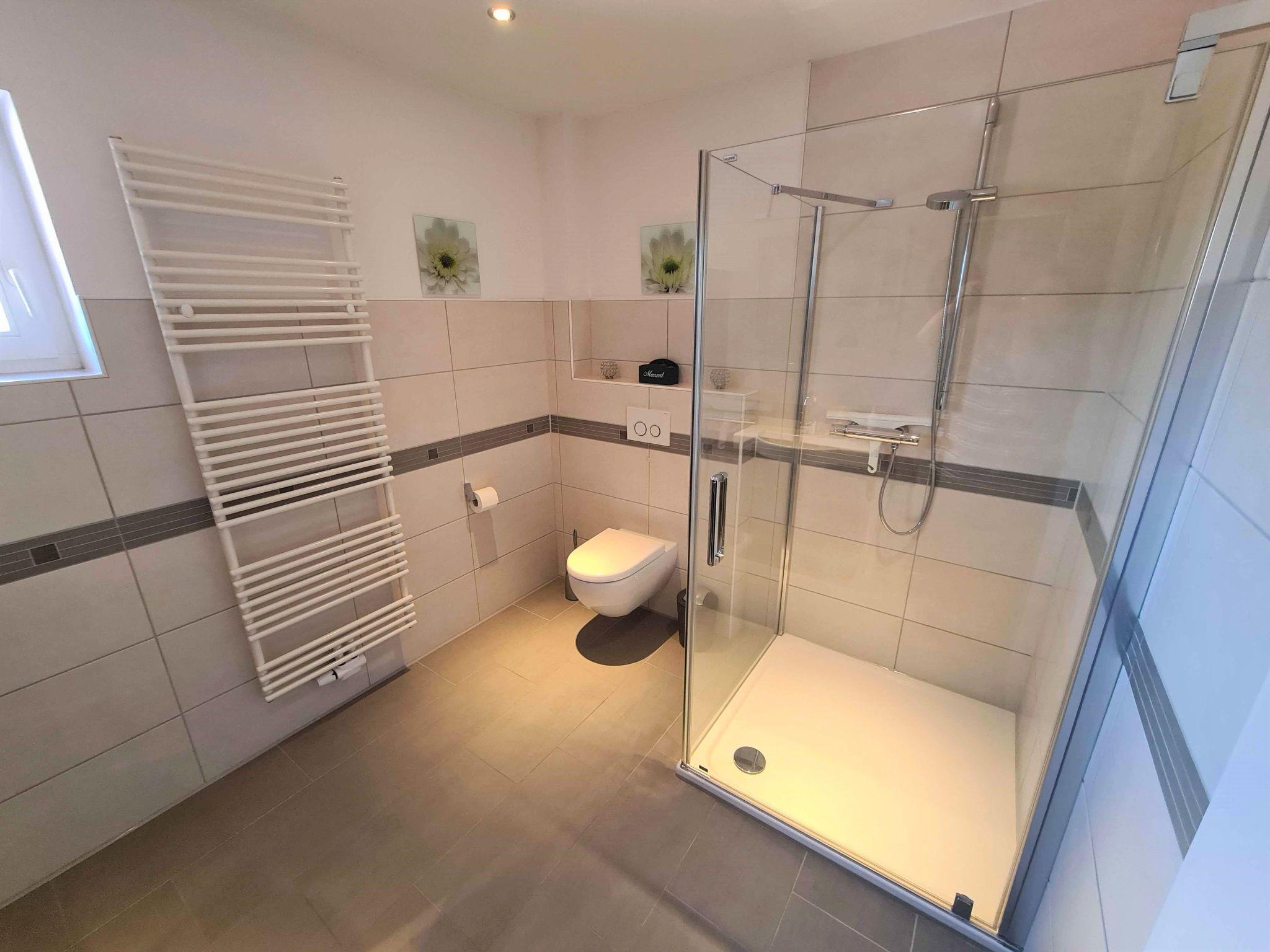 Inside, you will find a practically furnished flat with everything you need for a carefree holiday. A fully equipped kitchen with ceramic hob, filter coffee machine, dishwasher and kettle makes self-catering a breeze. A Smart TV provides entertainment, while the walk-in shower offers comfort. Shared facilities such as a washing machine and tumble dryer are also available in the building.