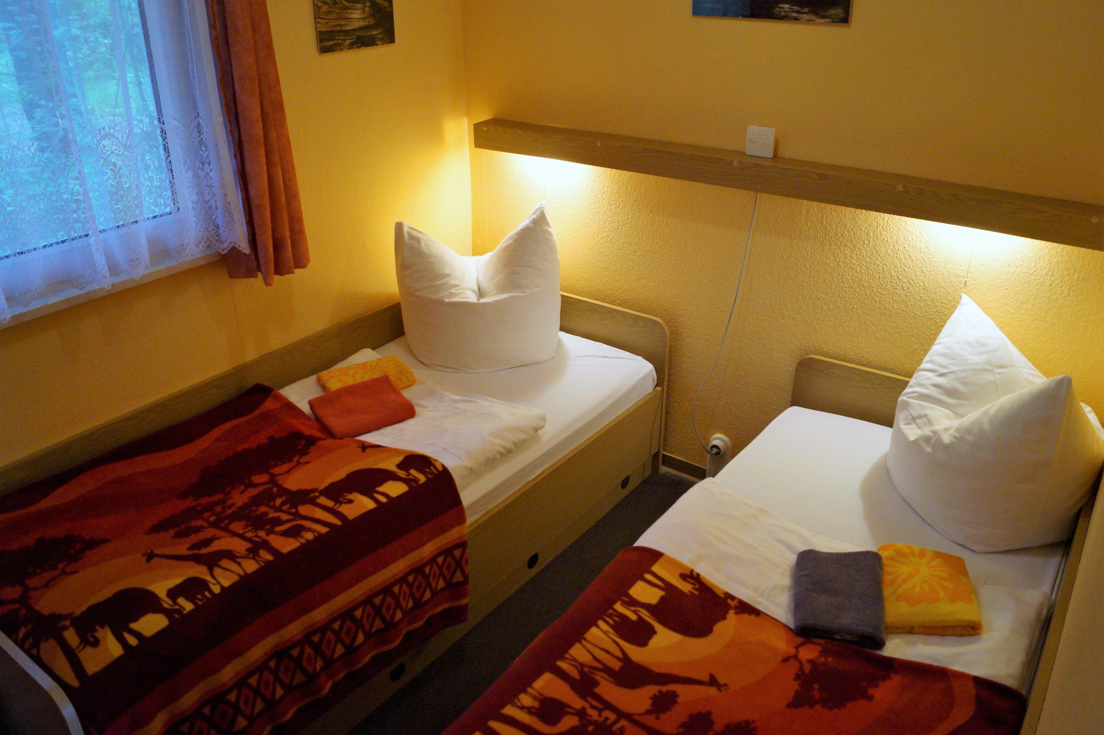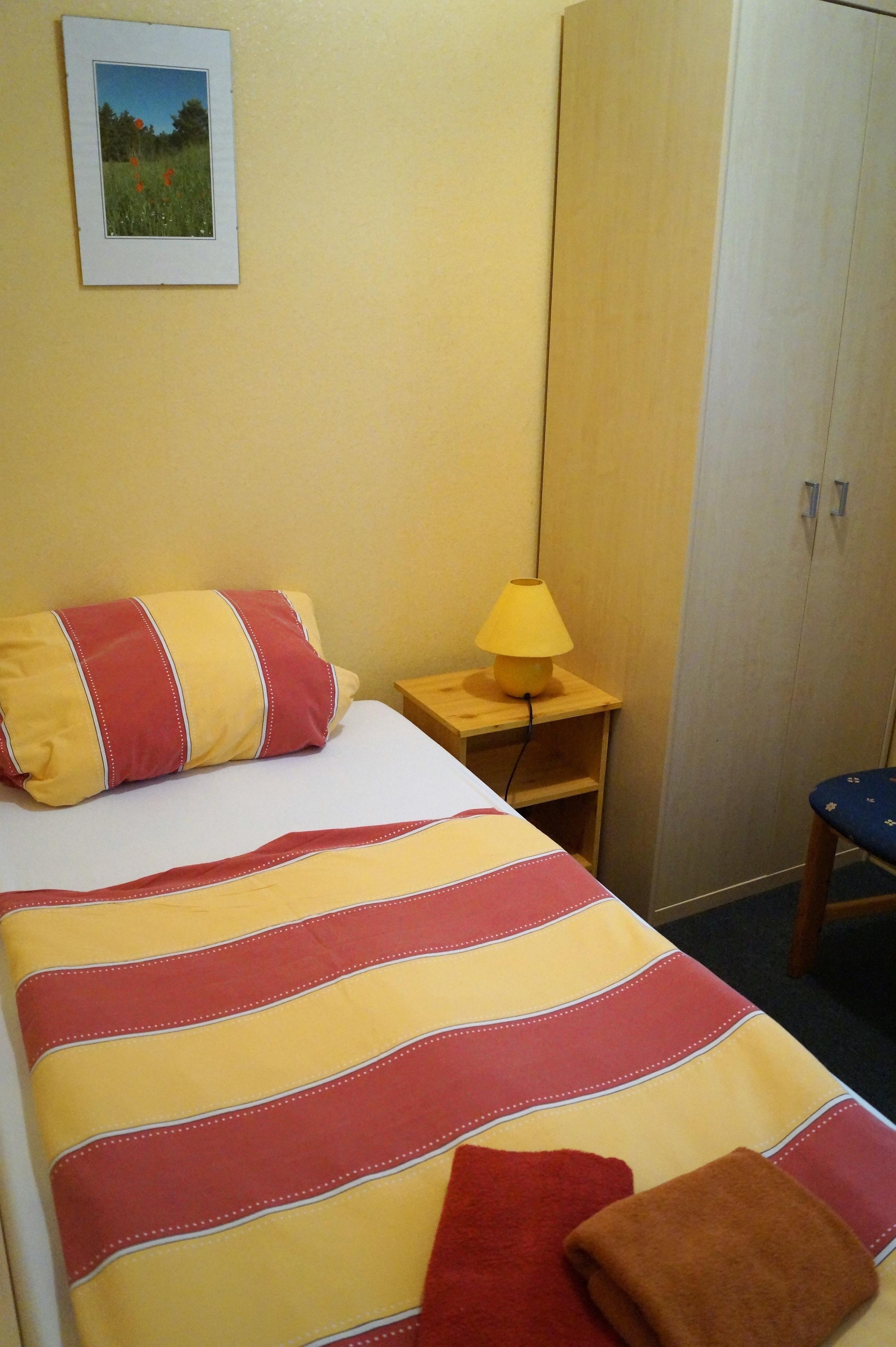 Bungalow Typ 3 ist ein komplett renoviertes alleinstehendes Ferienhaus für bis zu 3 Personen (3 Erw.). Die Nutzfläche beträgt ca. 38m² incl. eine mit Gartenmöbeln ausgestattete Terrasse, eine komplett eingerichtete Kleinküche mit Elektrokochplatten, Kühlschrank, Spüle, Kaffeemaschine etc., zwei Schlafräumen, einer mit zwei Einzelbetten und einer mit einem Einzelbett, sowie ein Bad mit Dusche & WC.