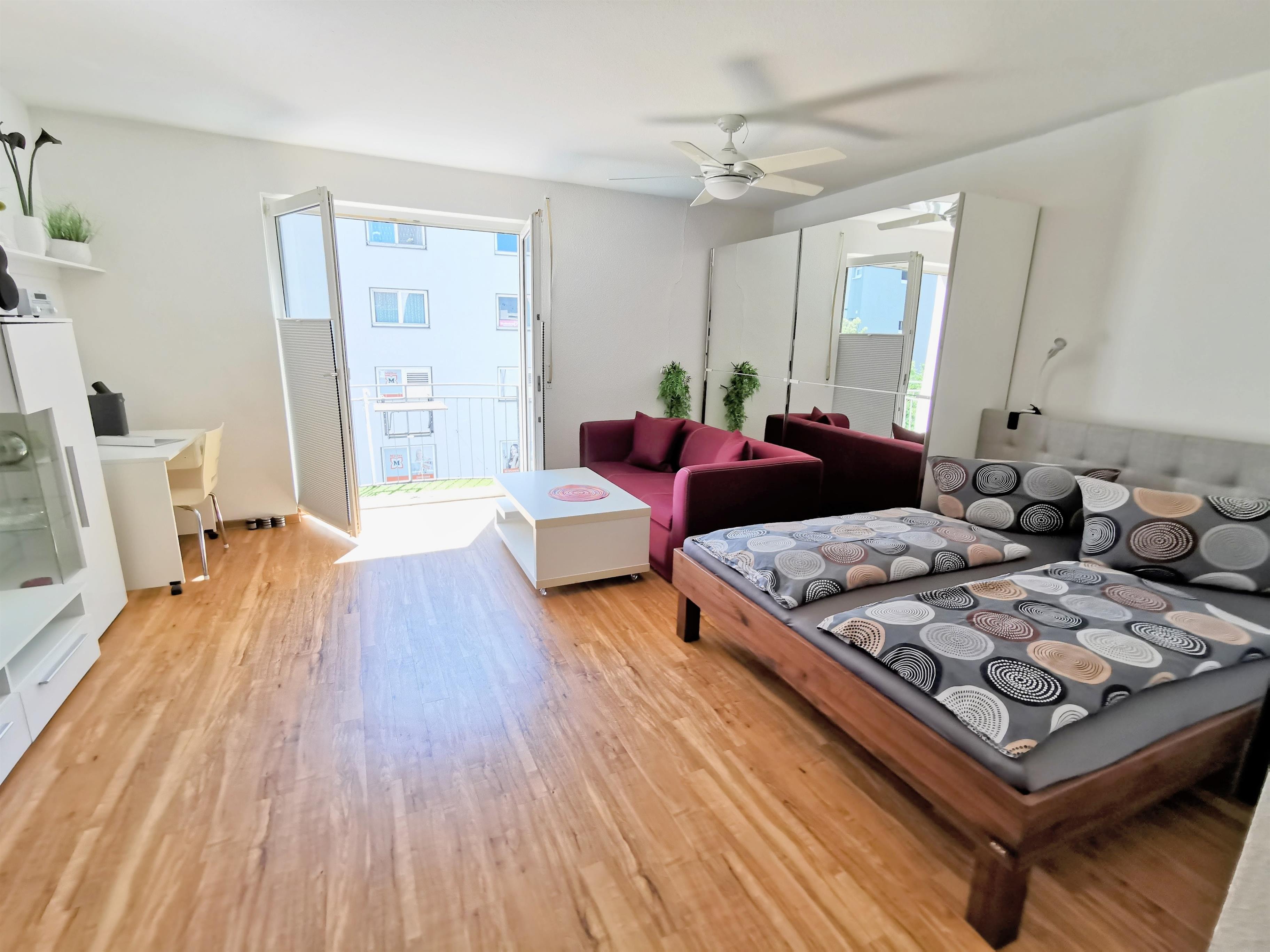 Die 1-Zimmer-Ferienwohnung verfügt über einen Wohnraum mit französischem Balkon.
