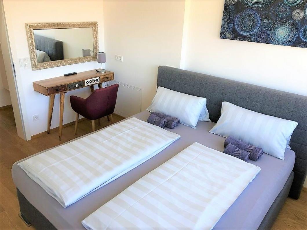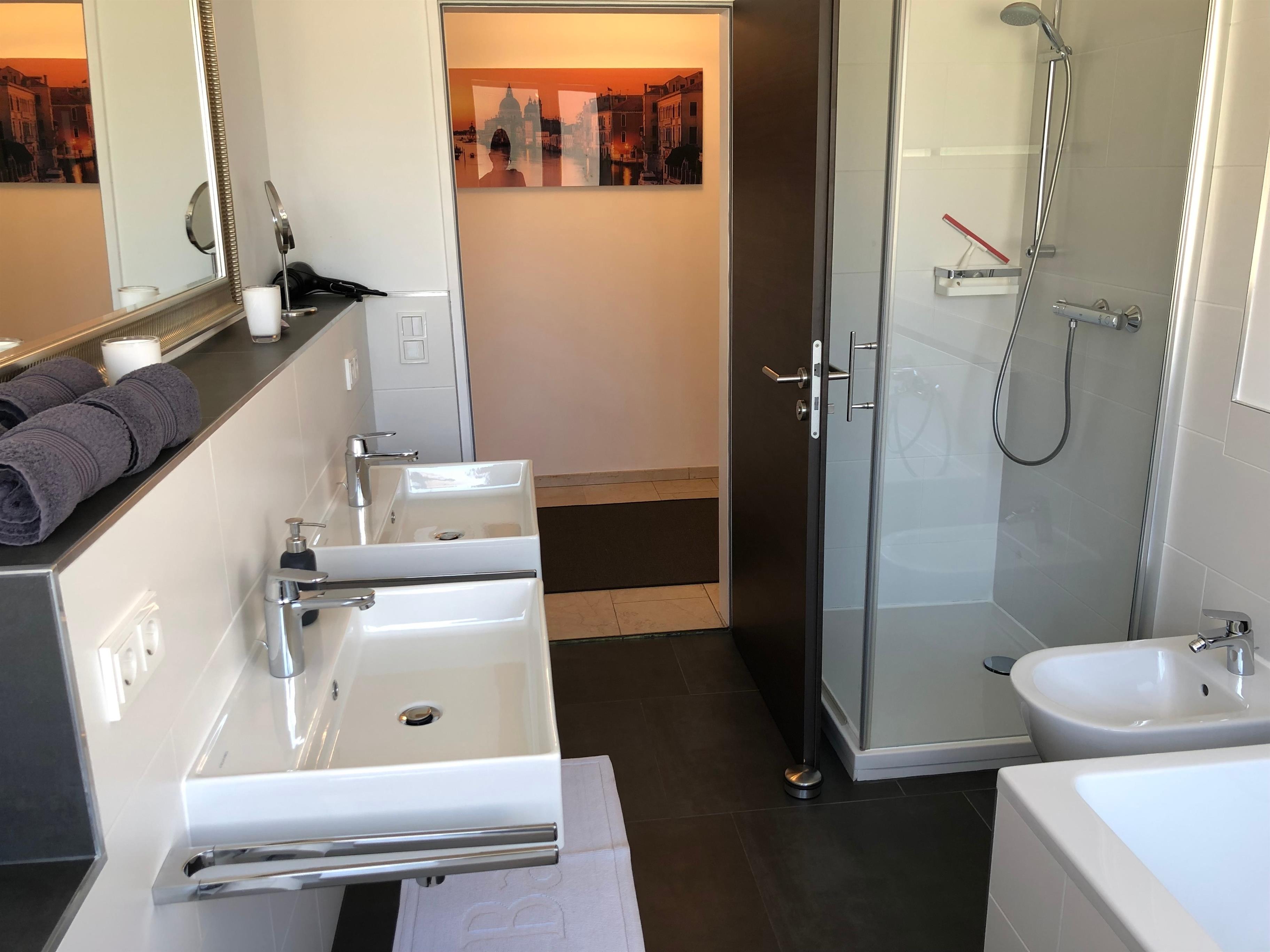 Die Wohnung ist komplett neu und nach dem Standard KfW-70. Sie besteht aus 3 geräumigen Schlafzimmern und ist insgesamt 140 m² groß. Die gemütlichen Doppelbetten laden nach einem ereignisreichen Tag zum Relaxen ein. Im modernen und hellen Bad können Sie in der großen Badewanne entspannen. Zur Ausstattung der modernen Einbauküche gehören: Cerankochfeld, Backofen, Mikrowelle, Spülmaschine, Filterkaffeemaschine und Kühlschrank mit Gefrierfach. Im Wohnbereich sowie in jedem Schlafzimmer ist ein Fernseher vorhanden. Außerdem gibt es zwei Kinderhochstühle (Hauk), 2 Babybetten. Das Badezimmer ist mit Dusche, Badewanne und Doppelwaschbecken ausgestattet. Außerhalb der Wohnung befindet sich ein zweites Duschbad mit Waschmaschine und Trockner, welches gerne für Ihren Aufenthalt genutzt werden darf.