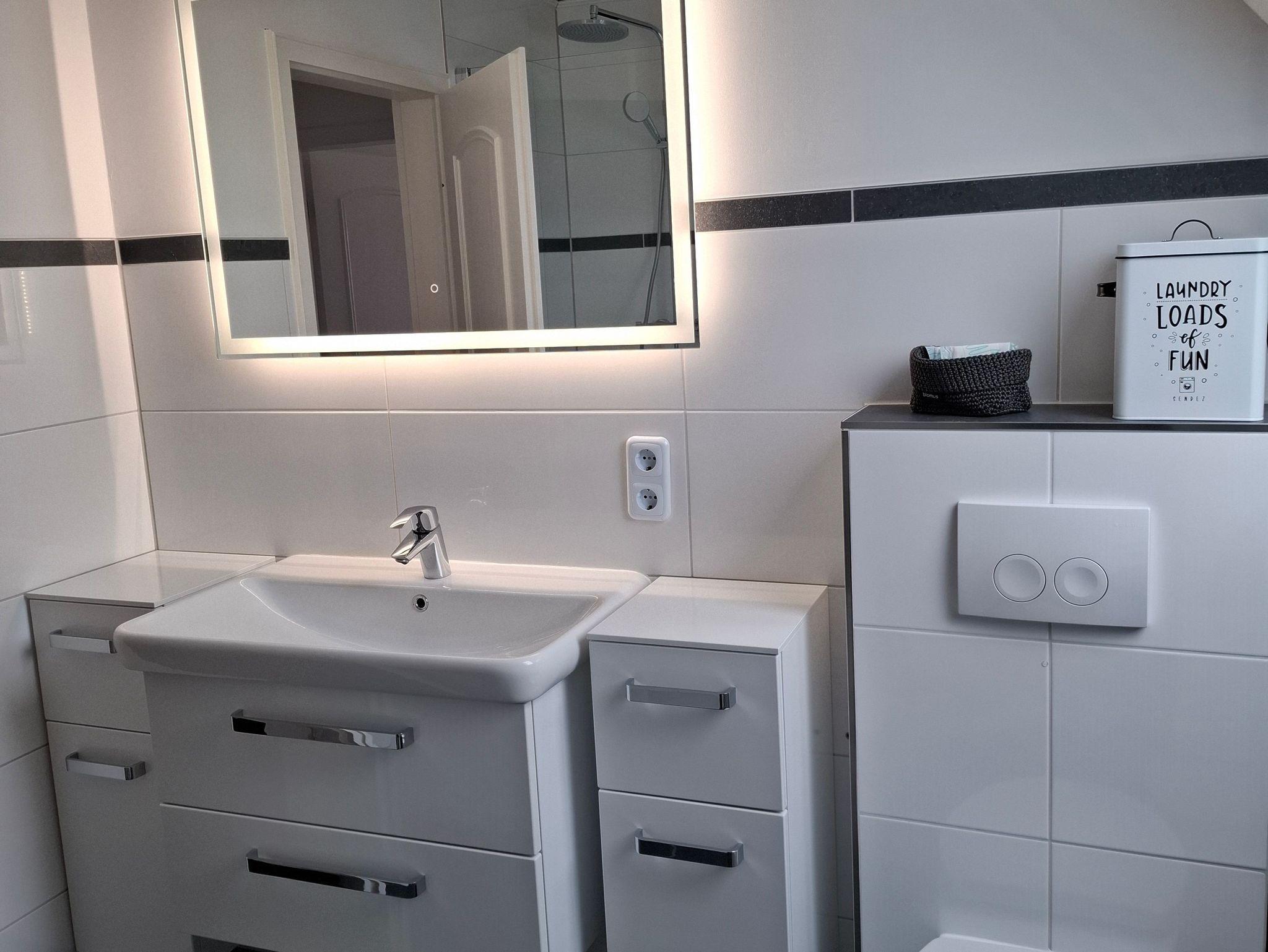 Modernes Duschbad mit bodentiefer Dusche, beleuchtetem Spiegel, Kosmetikspiegel, Fön, Fußbodenheizung und Waschmaschine