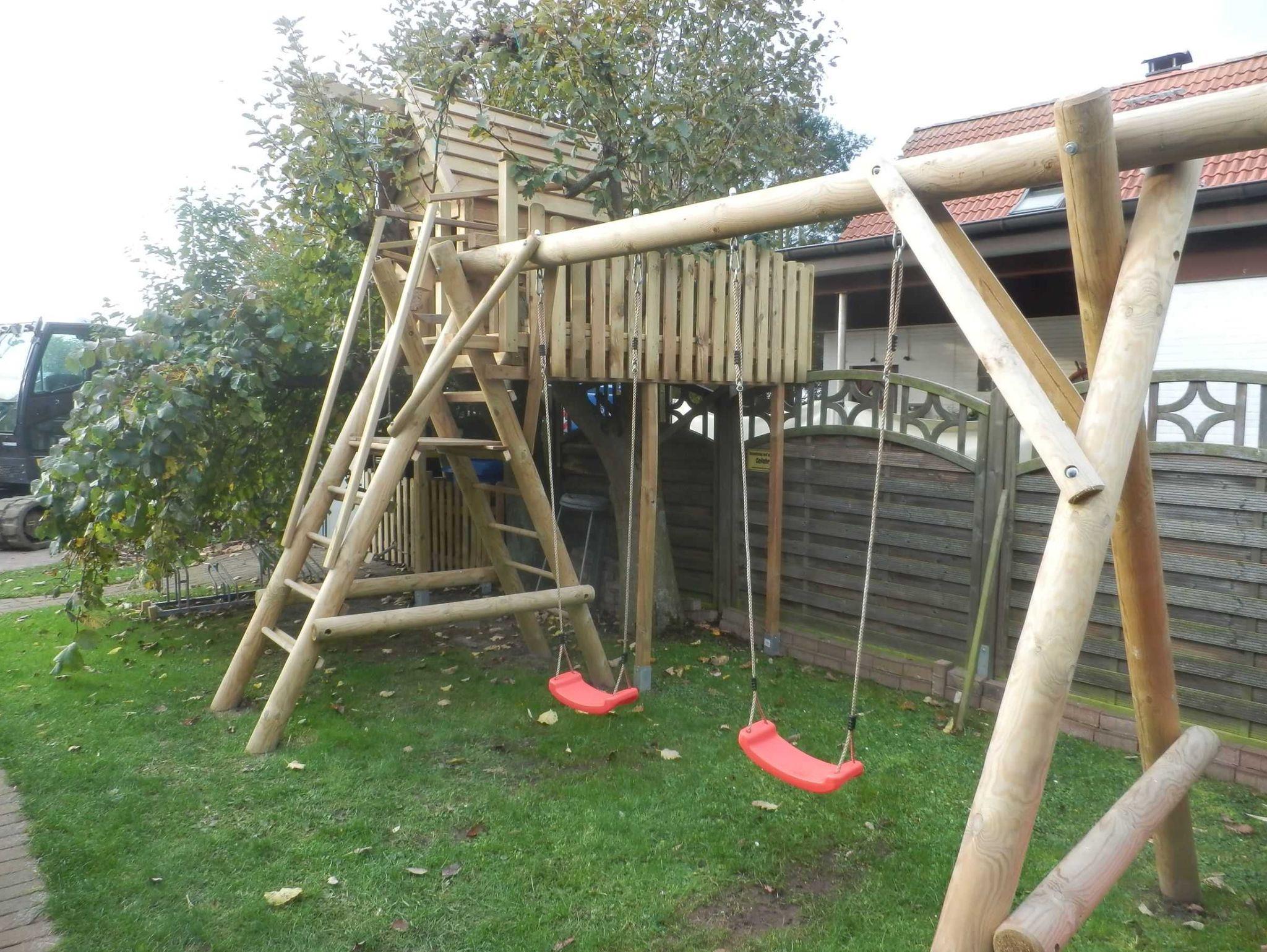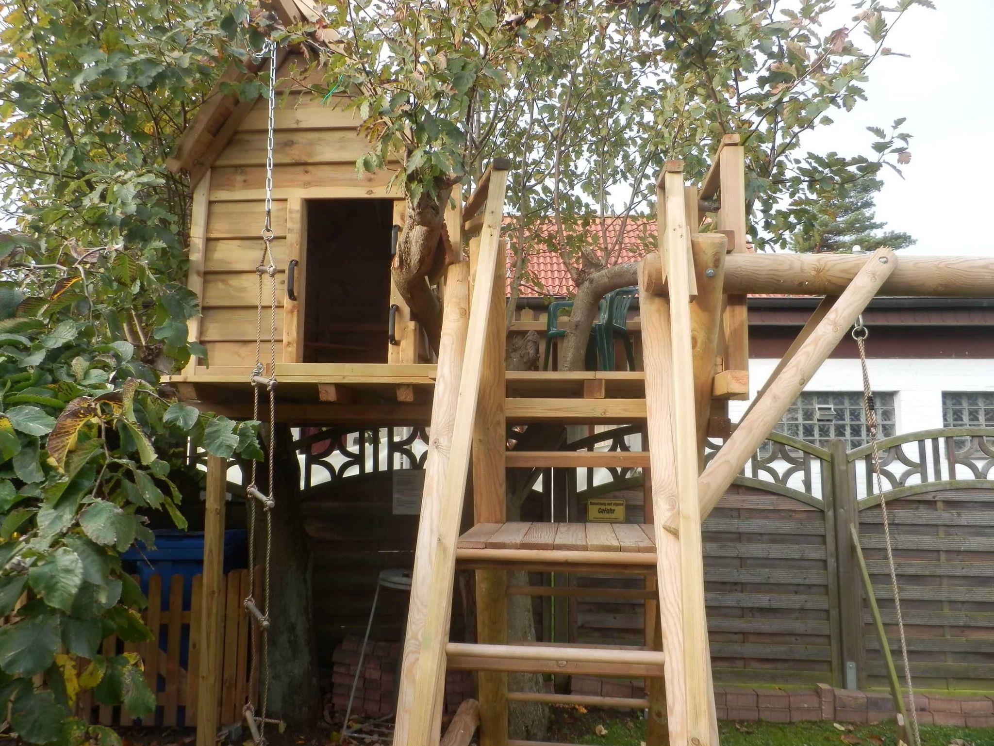 Spielgeräte für Kinder im Garten mit einem Baumhaus.