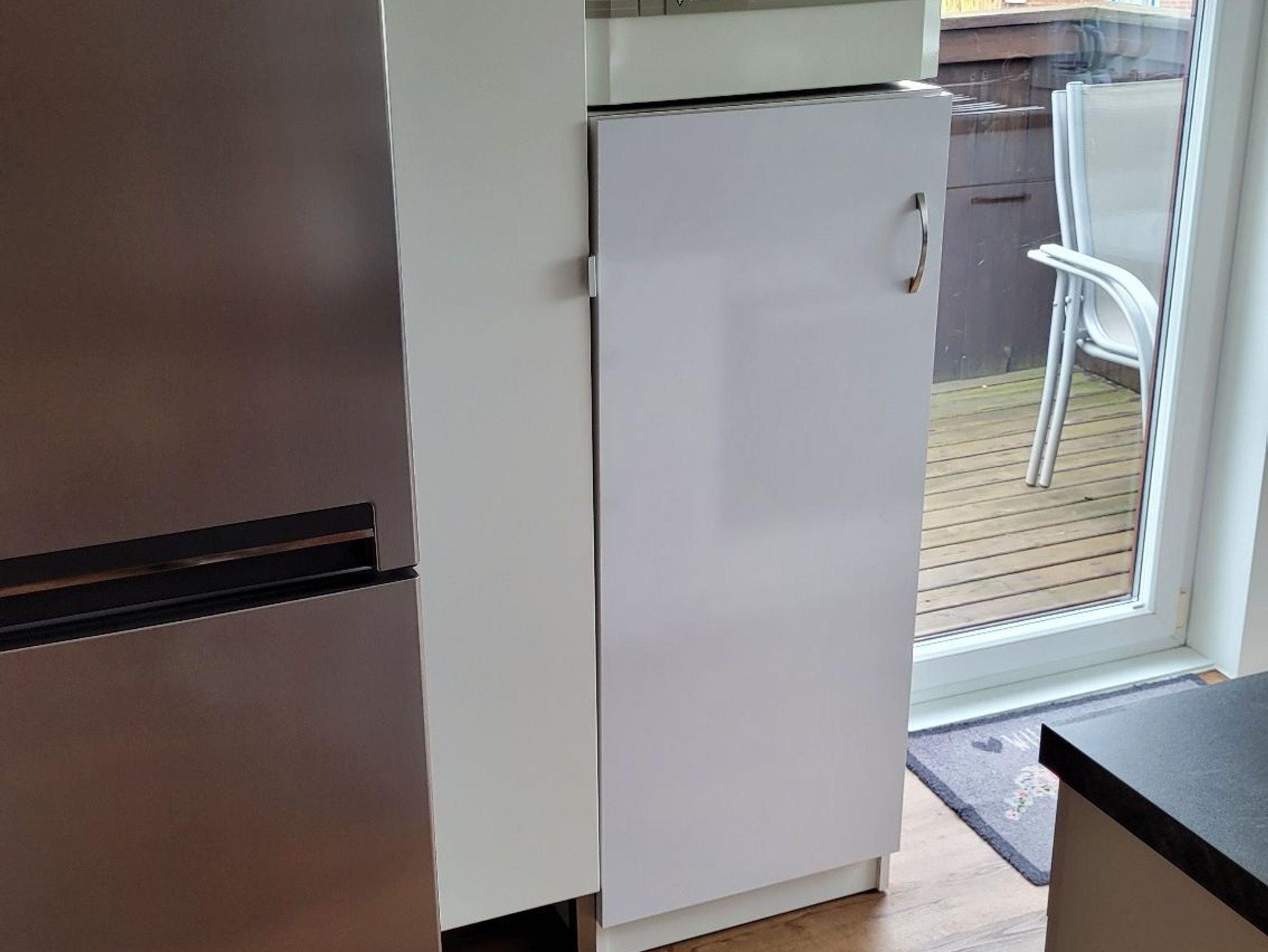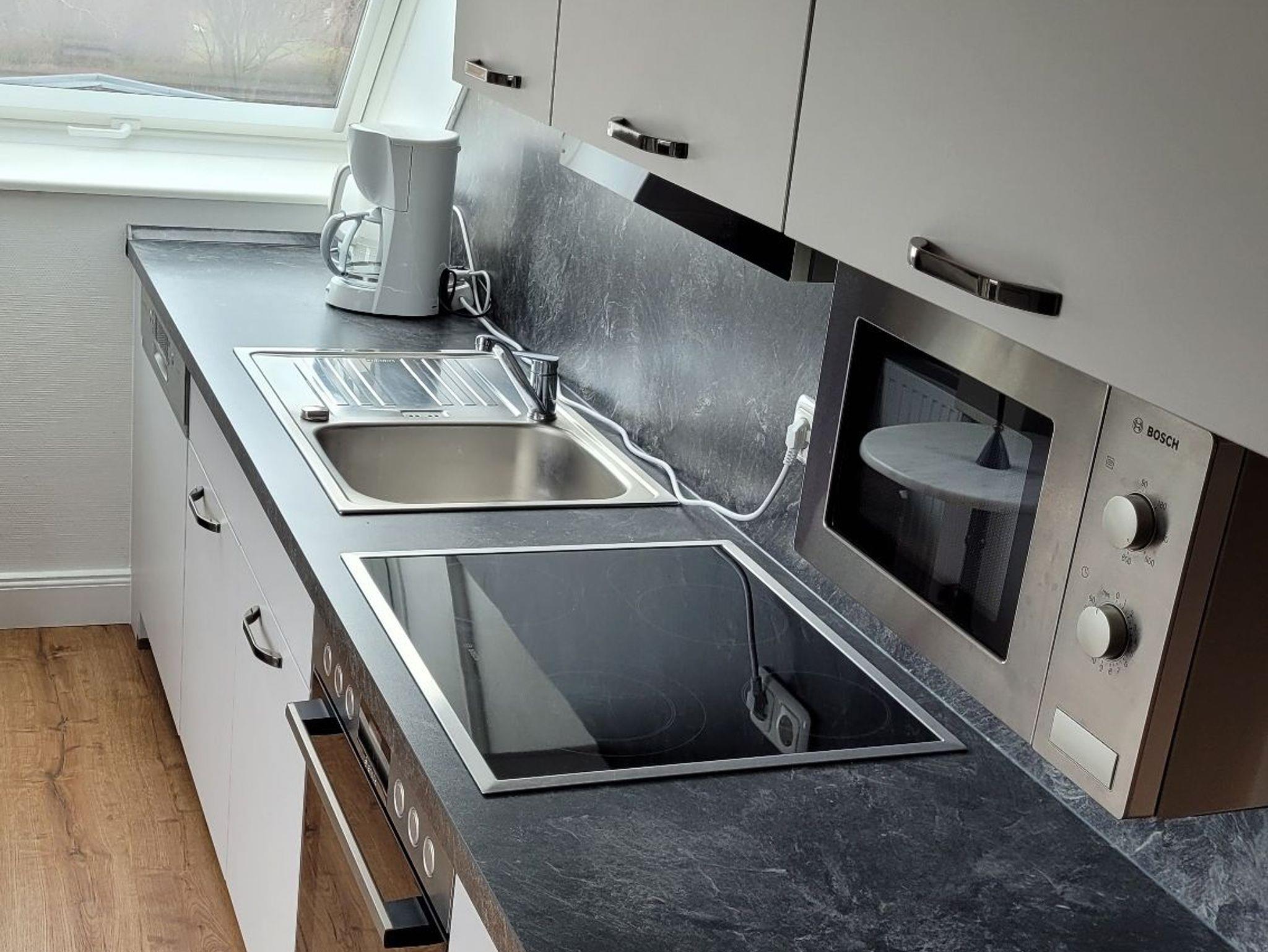 • separate Küche mit Einbauküche (E-Herd mit Ceranfeld und Backofen, Mikrowelle, Geschirrspüler, separat stehender Kühl- und Gefrierschrank (1,90 m Höhe))