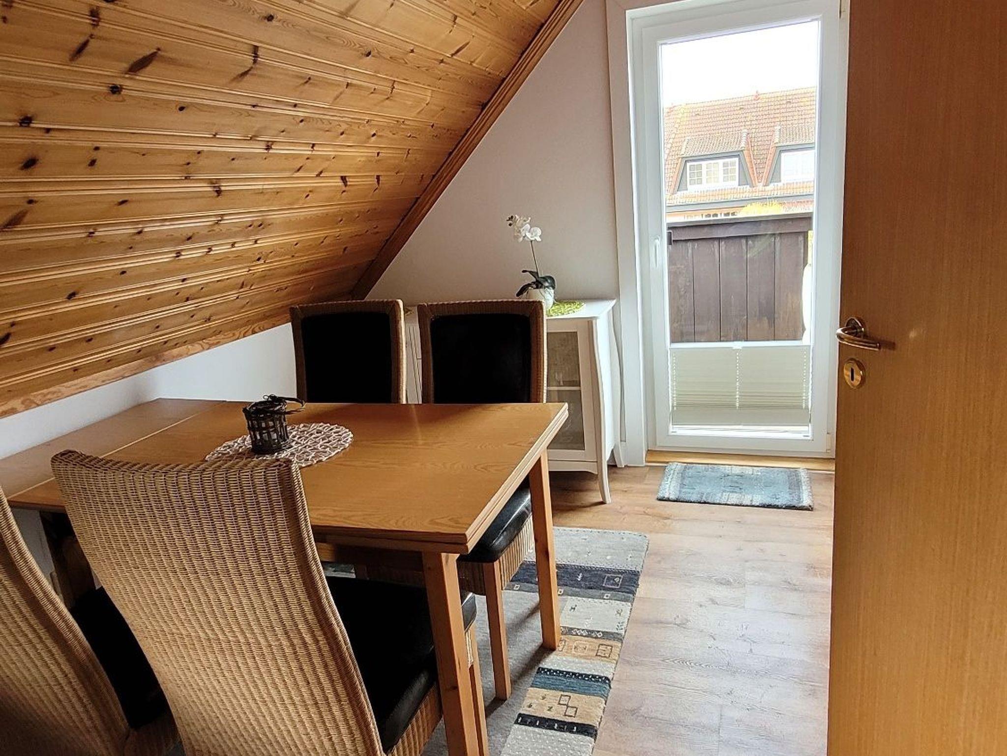 Dachgeschoss, bis drei Personen, ca. 45 m² große, gemütliche Wohnung mit Kieferndecken. In der Wohnung befinden sich Flur, gemütlicher Wohn-/Schlafraum mit Essecke, Badezimmer mit Wanne, separate Küche mit Einbauküche.