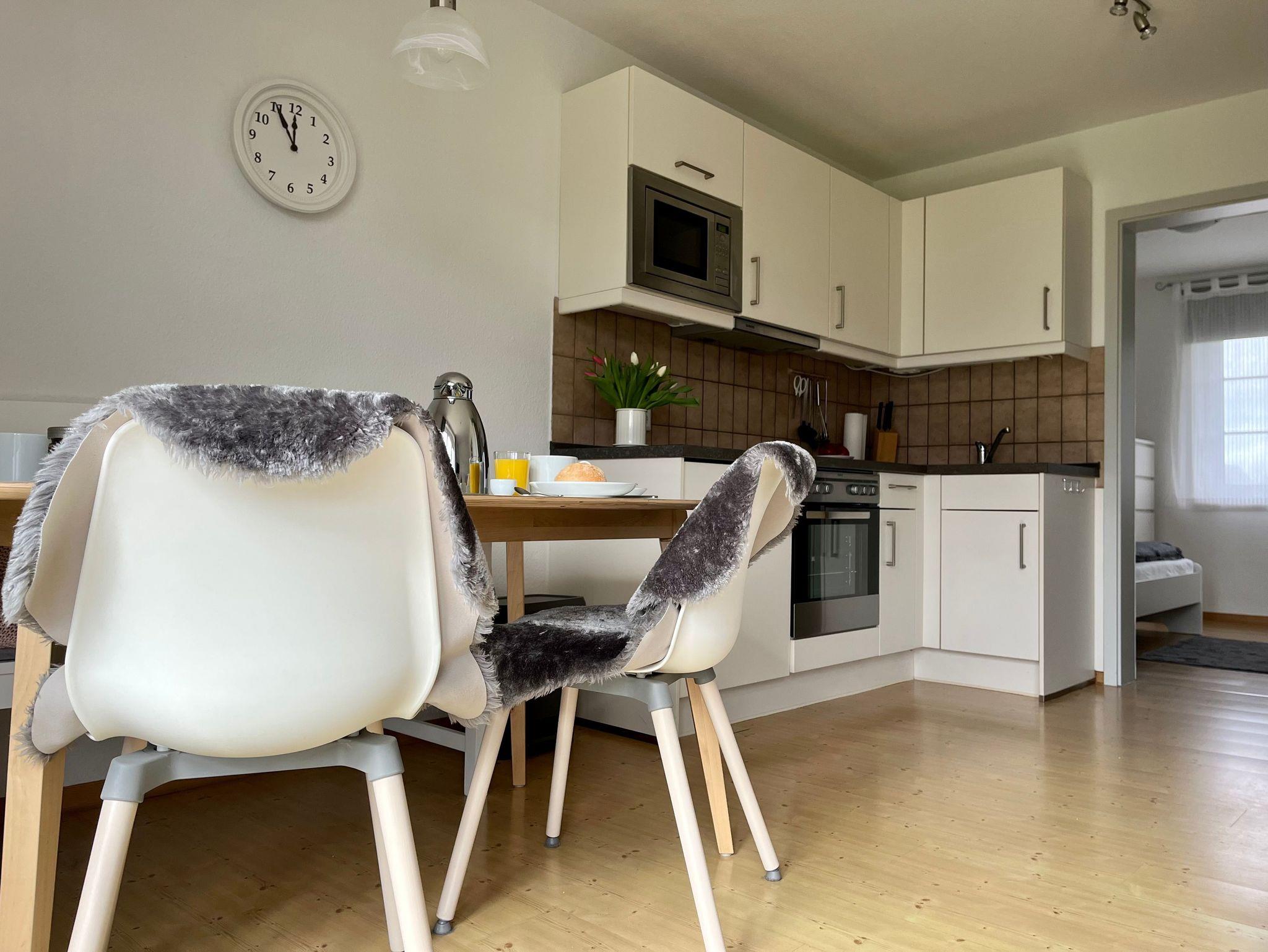 • 1 Wohnraum mit Einbauküche mit Backofen, Mikrowelle, Kaffeemaschine, Toaster und Wasserkocher