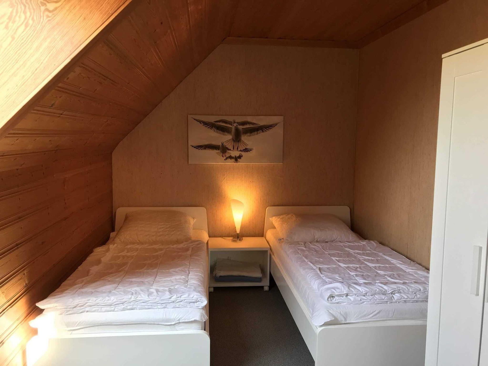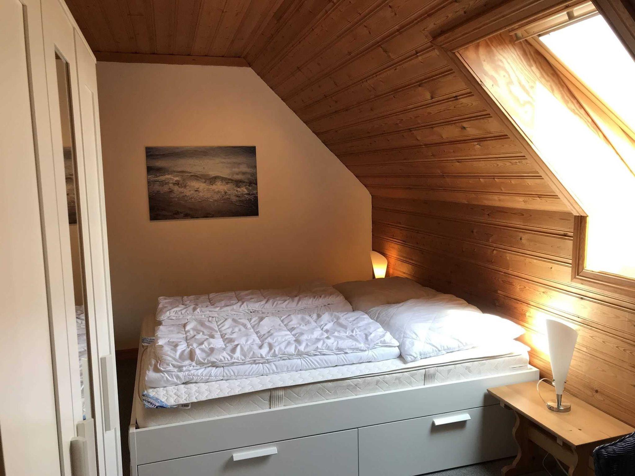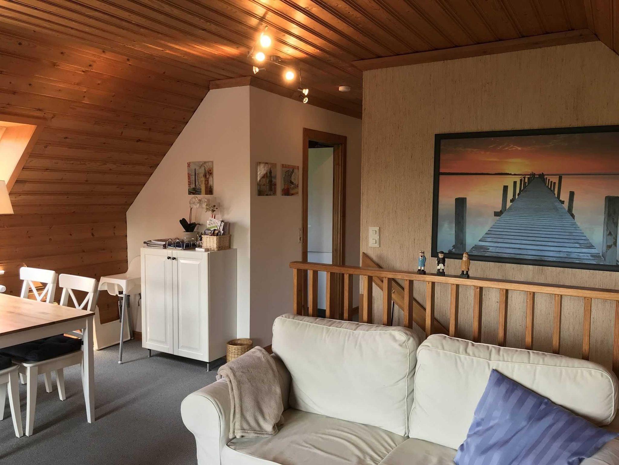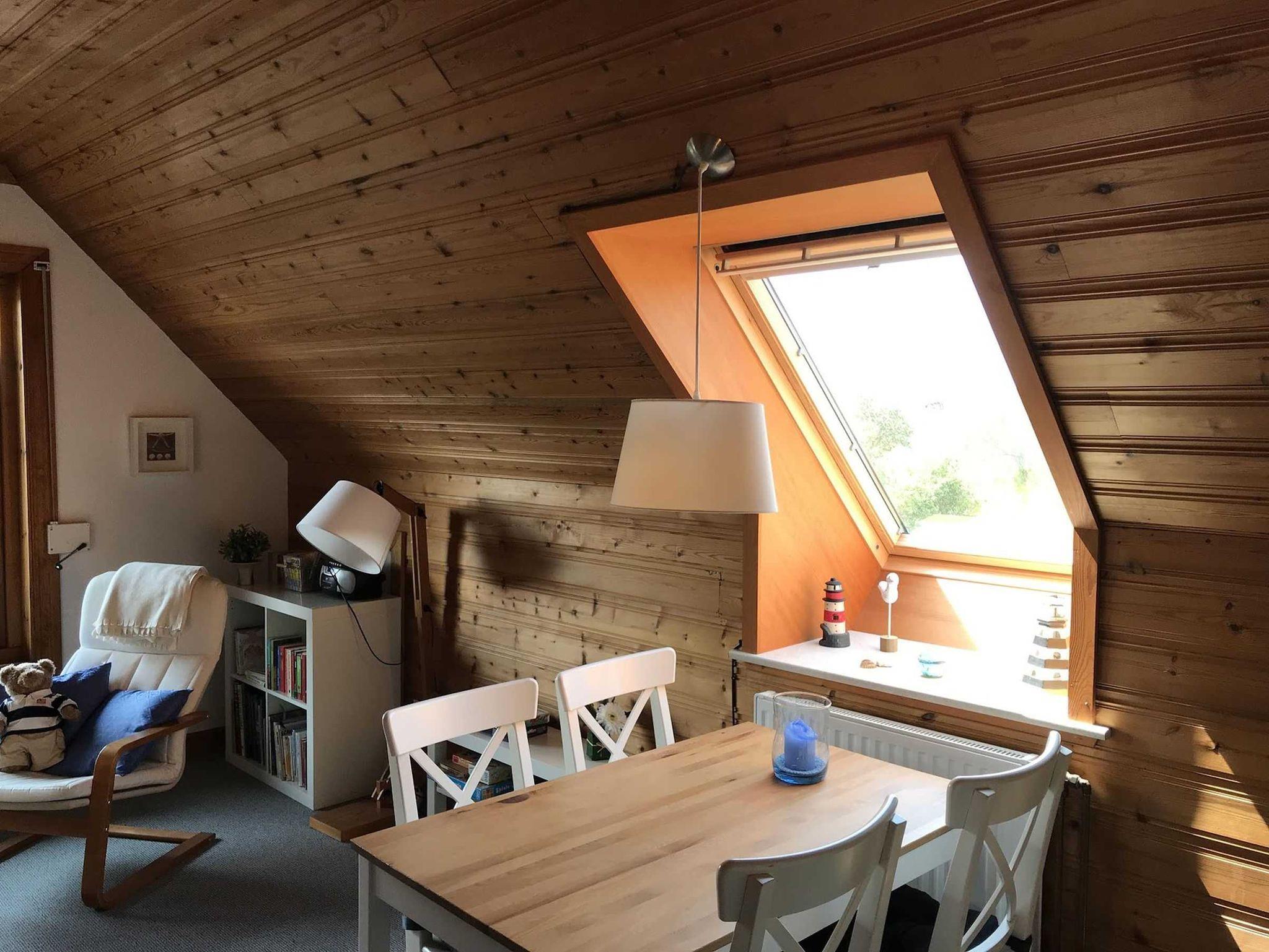 Die Wohnung im Obergeschoß unseres skandinavischen Ferienhauses hat einen eigenen Balkon, ein großes Wohnzimmer, eine kleine Küche mit herrlichem Blick auf den Deich, ein schönes Bad und zwei gemütliche Schlafzimmer mit jeweils zwei Betten. In der Wohnung ist Platz für 1-4 Personen.