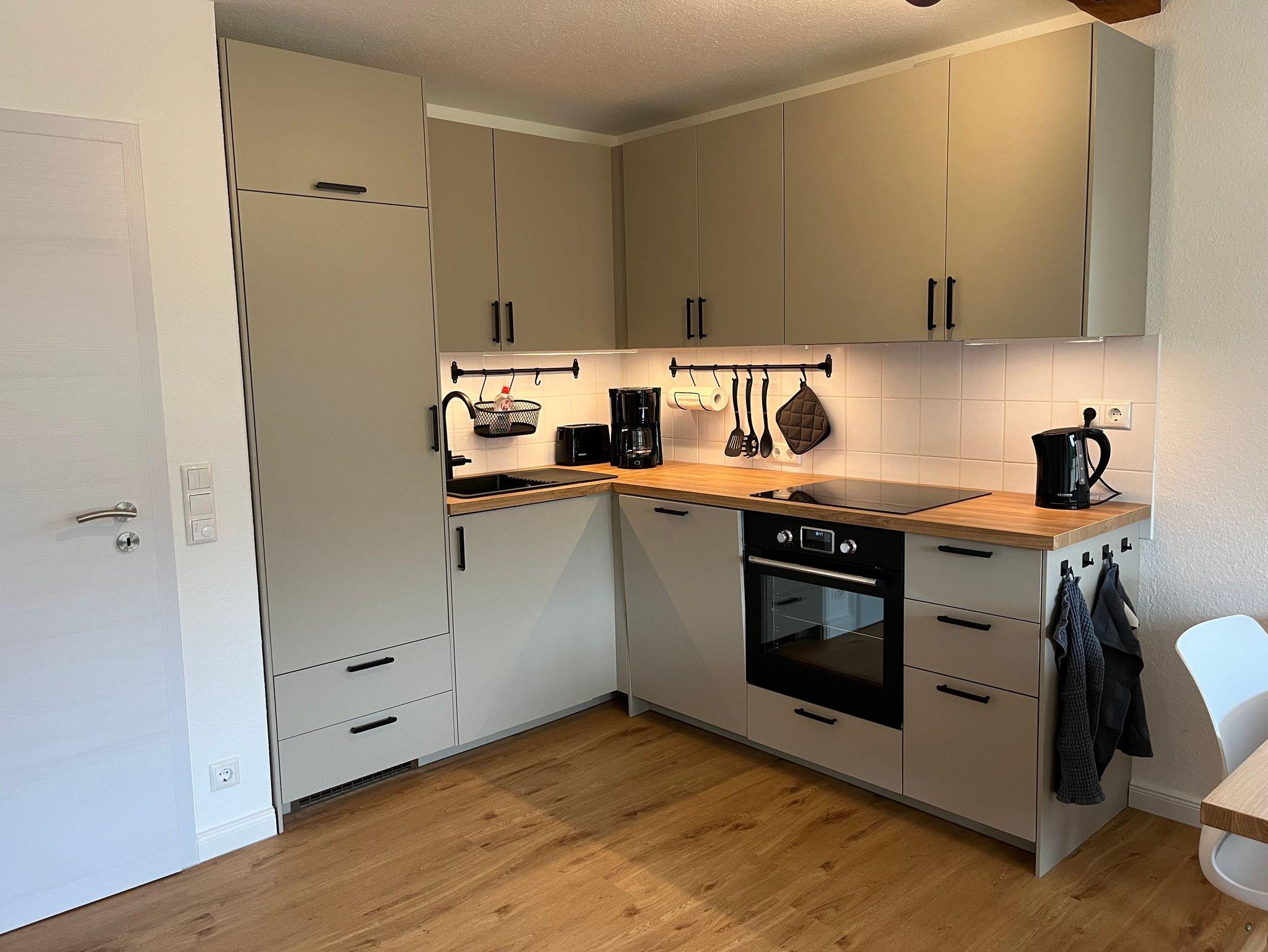 - Schöner, heller und offener Wohnbereich mit moderner Wohnküche. Diese ist mit Geschirrspüler, Backofen, Induktionskochfeld, Kaffeemaschine, Wasserkocher und Kühlschrank inkl. Gefrierfach ausgestattet