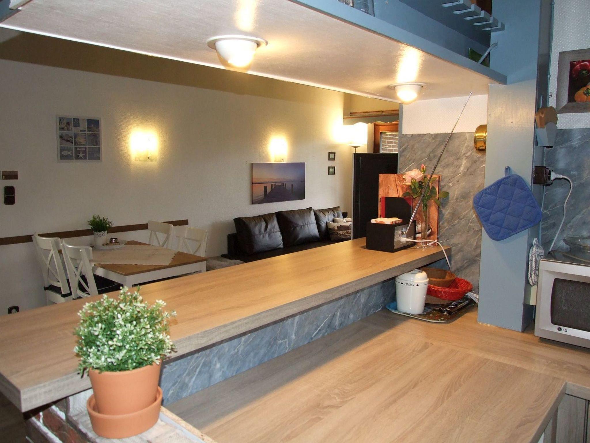 Der Wohnraum ist ebenerdig und 60 qm groß. Der Wohn-/essraum mit integrierter Küche wird durch einen Esstresen getrennt. Im Wohn-/essbereich sorgt der Kaminofen für wohlige Wärme an kühlen und kalten Tagen. Es gibt einen Schlafraum mit Doppelbett. Der zweite Schlafraum ist mit Einzelbett. Das Badezimmer lockt zum Entspannen mit einer Sauna.