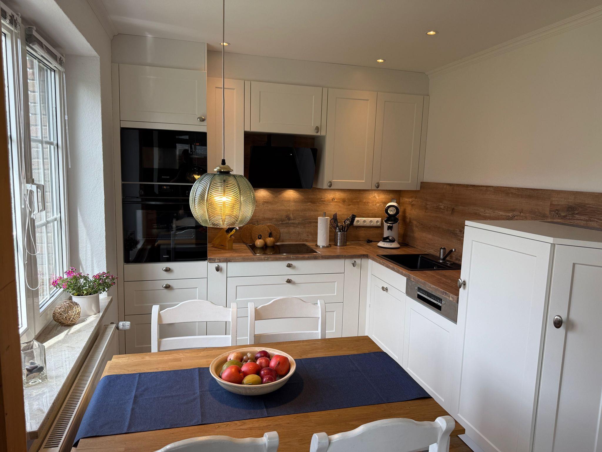 Wohn-Esszimmer: Geschirrspüler, Kühlschrank mit 3-Sterne-Gefrierfach, Umluft-Backofen, 4-Platten-Cerankochfeld, Mikrowelle