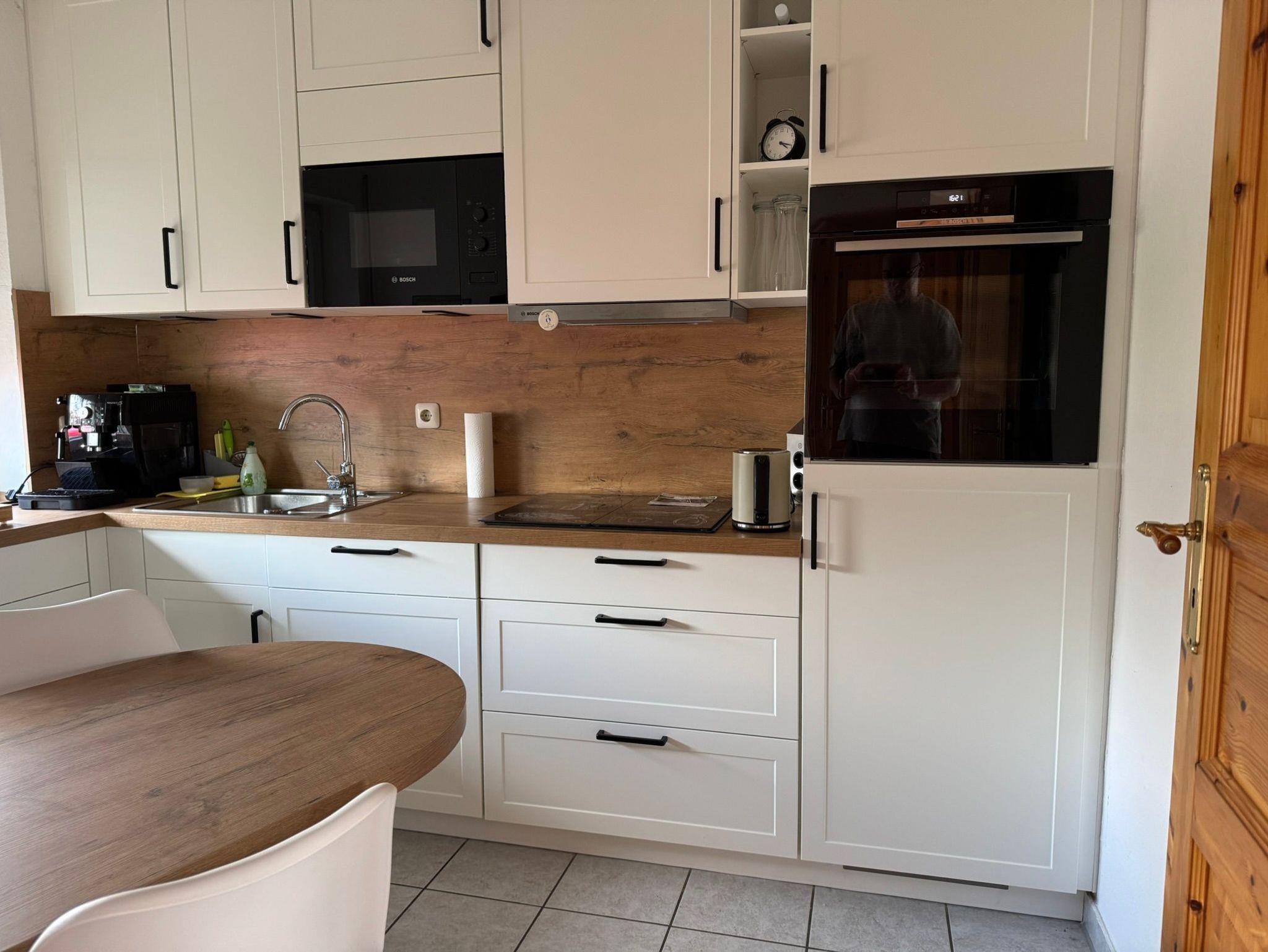 Separate Küche mit Kühl-/Gefrierkombi, Geschirrspülmaschine, Backofen, Induktions-Kochfeld, Mikrowelle und Kaffeevollautomaten.