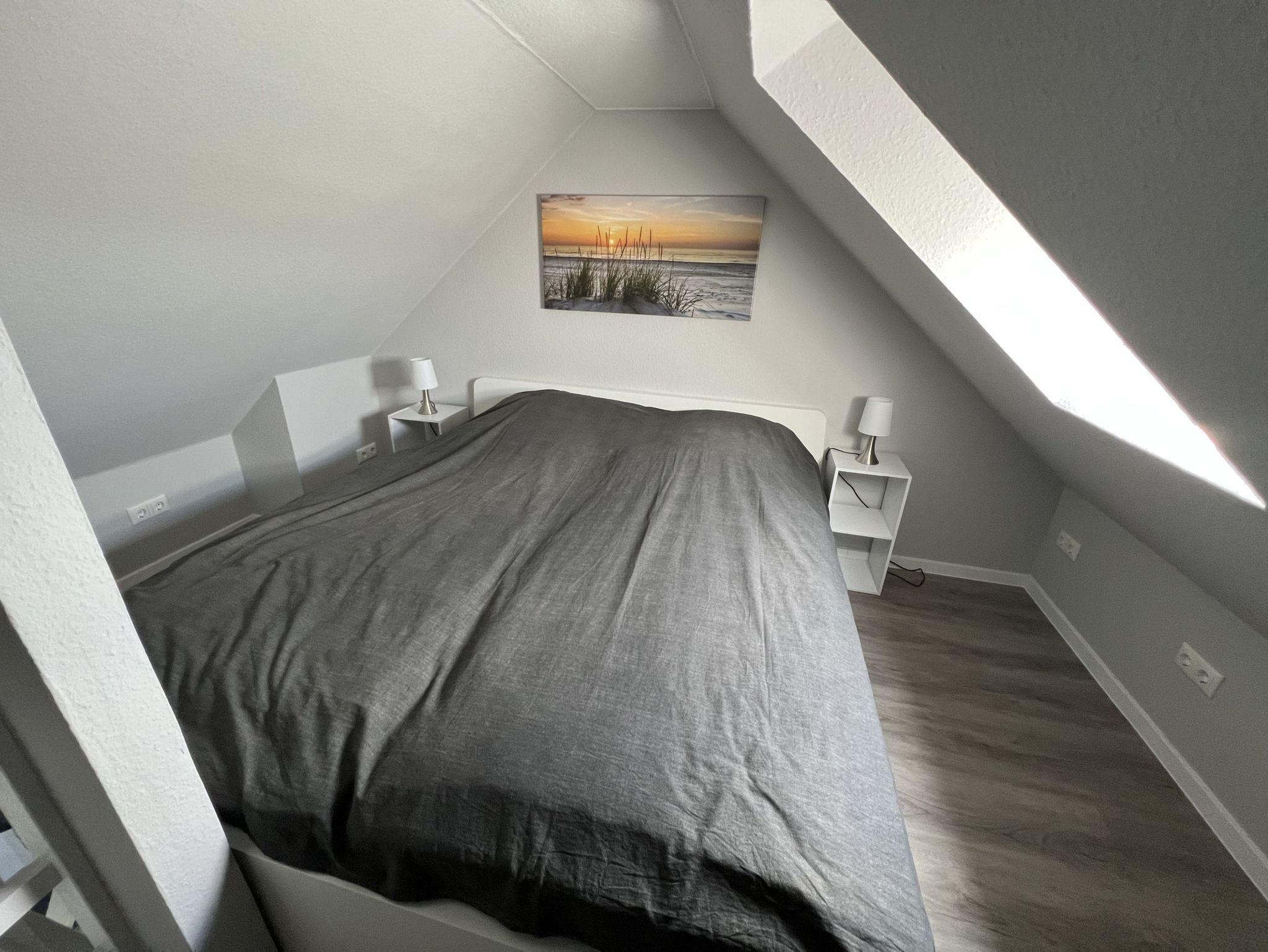 Die Ferienwohnung hat zwei Schlafzimmer, ein Schlafzimmer mit Doppelbett im ausgebauten Dachboden (Treppe ins DG steil und schmal) und 1 Schlafzimmer mit zwei getrennt stehenden Betten. Kombi. Wohn-/Esszimmer mit Küchenzeile. Die Küche ist komplett eingerichtet mit Backofen, Microwelle und 4 Platten- Cerankochfeld.