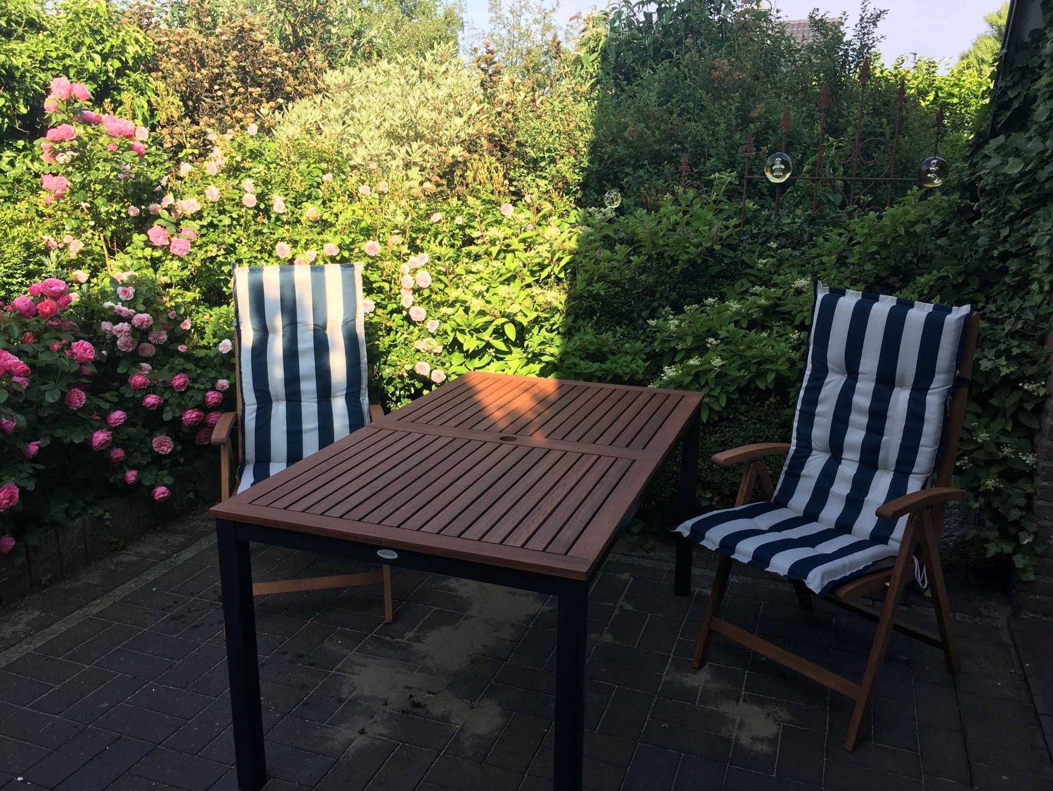 Auf der einladenden Terrasse im Rosengarten lädt eine Sitzgarnitur zum Verweilen ein. Zum Haus gehört eine Auffahrt mit Parkmöglichkeit und ein Geräteschuppen.