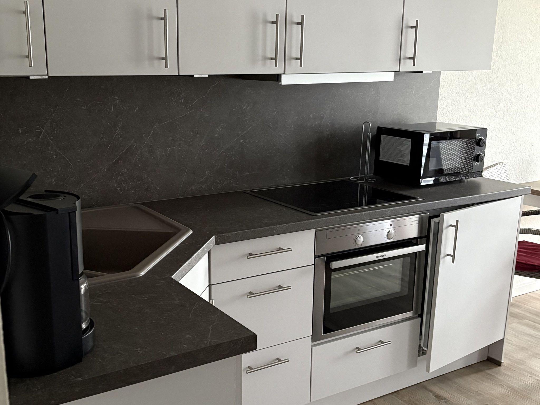 • Offene Küche mit Backofen, Cerankochfeld, Kühlschrank mit Gefrierfach, Mikrowelle, Kaffeemaschine, Wasserkocher, Geschirr, Besteck, Kochgeschirr