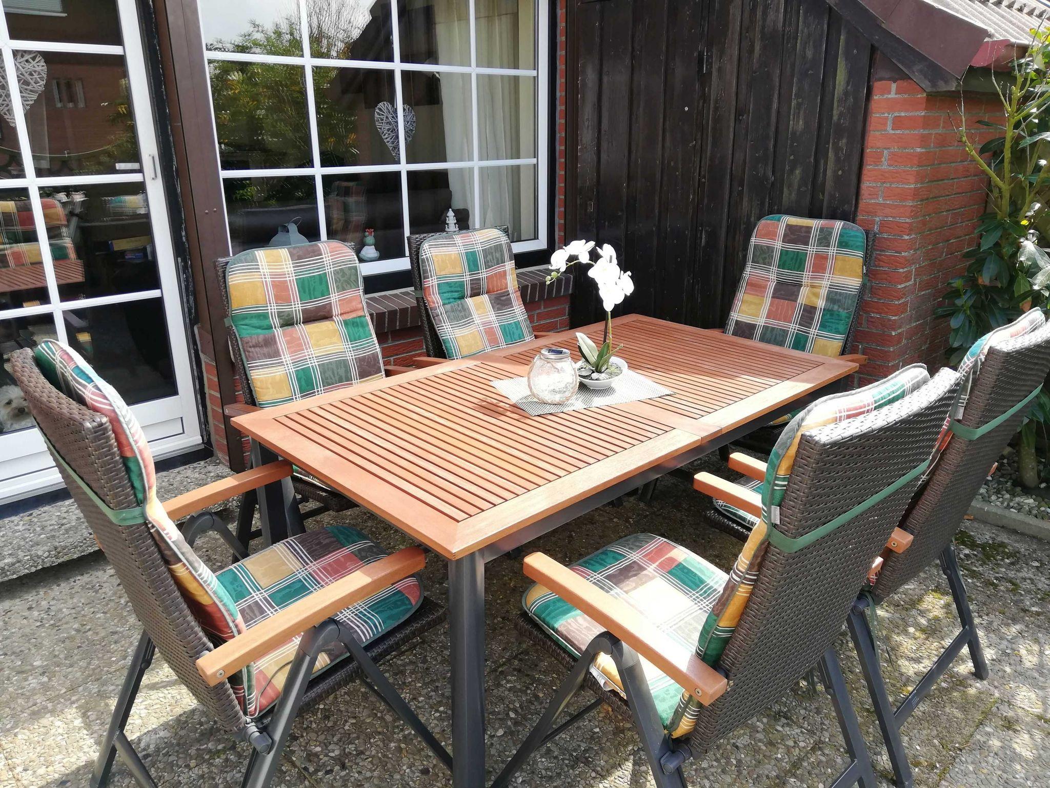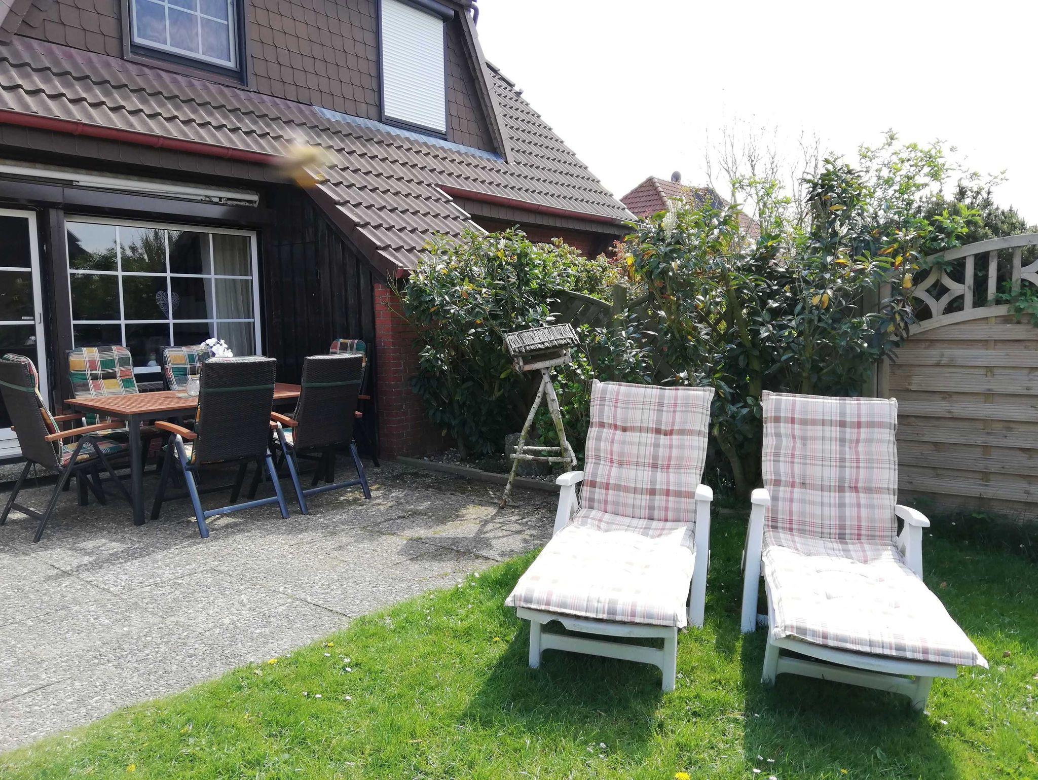 • Terrasse mit Markise, Gartenmöbeln und 2 Sonnenliegen (komplett mit Auflagen), Grill