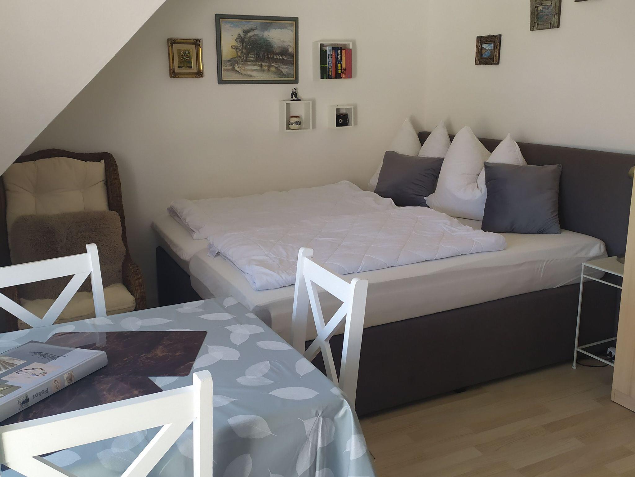 • kombinierter Wohn-/Schlafraum mit Boxspringbett (180 x 200cm, Einzel Matratzen)