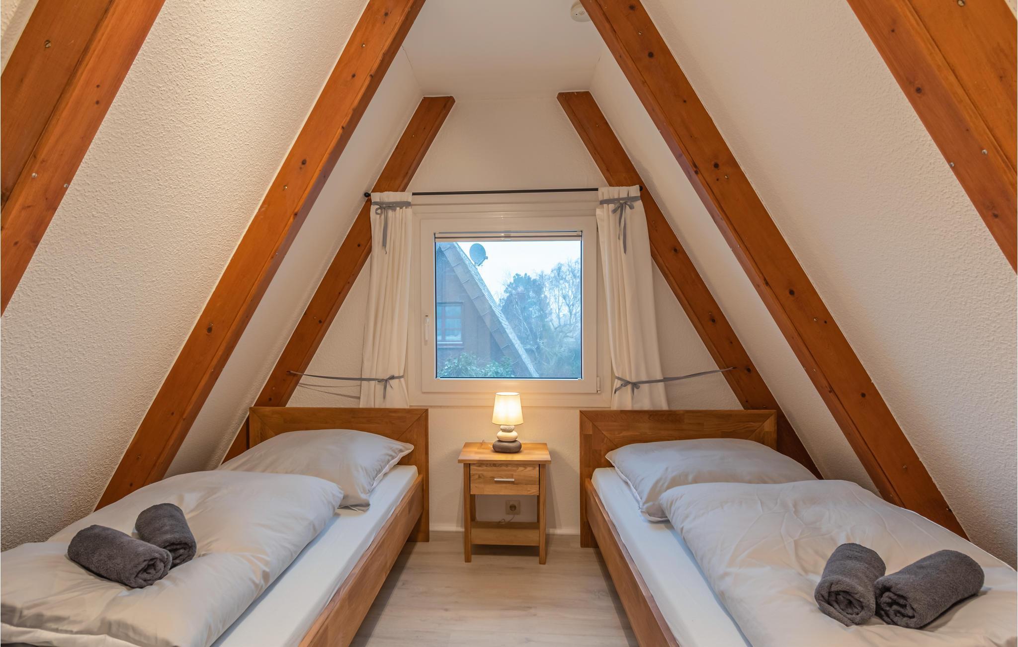 Velkommen til dette indbydende sommerhus med to soveværelser og mulighed for at medbringe et kæledyr. Det ene soveværelse har en dobbeltseng, det andet har to enkeltsenge. Indretningen er lys og smagfuld, træbjælkerne på de skrånende vægge giver værelserne en særlig stemning, og store vinduer sørger for en dejlig udsigt.