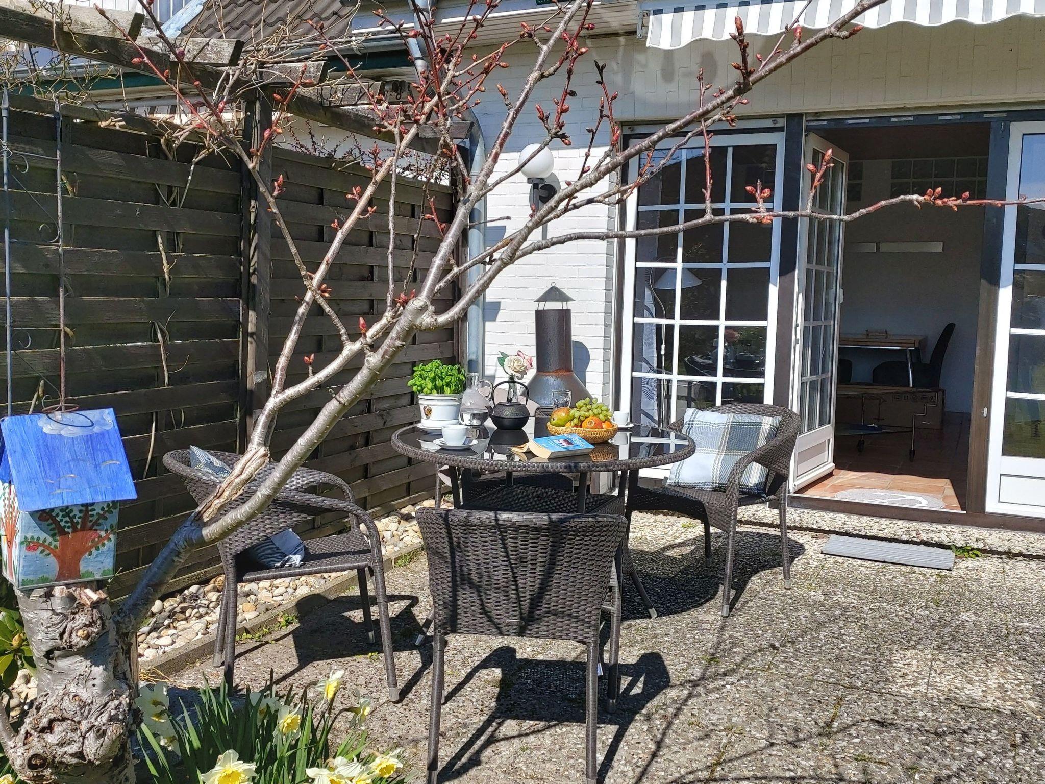 - 4 chairs and a round table, which can easily be stored in the small garden shed.