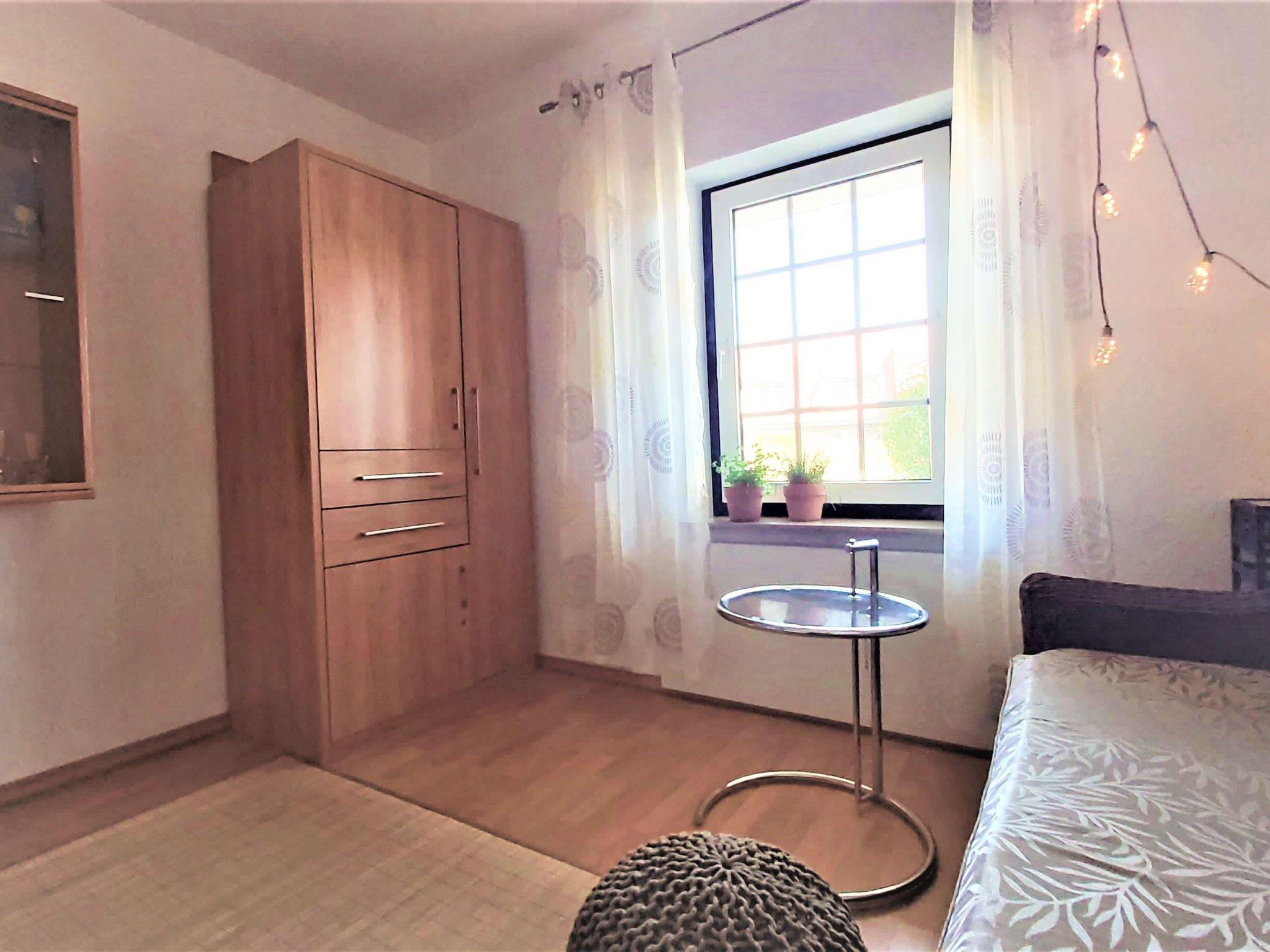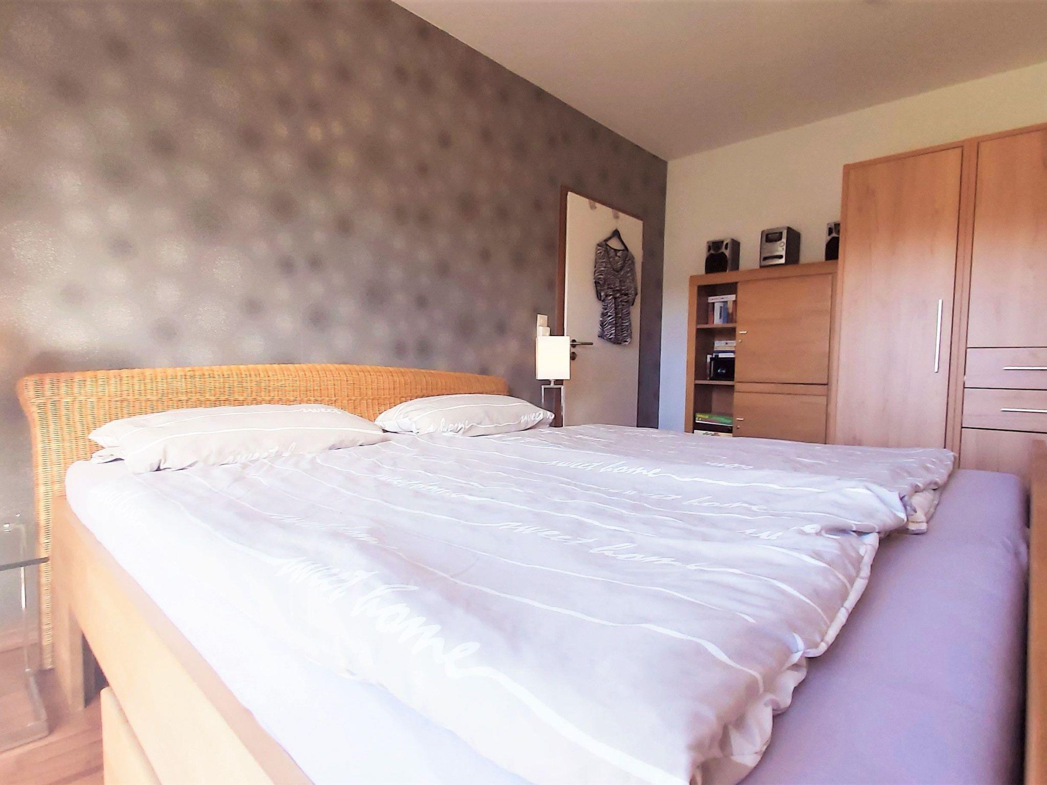 - From bedroom 1 you step directly onto the terrace in the morning. Soak up the peace and nature. The 180x200cm double bed at a comfortable height and the darkening through the external blinds contribute to a peaceful night's sleep. You will also find ample wardrobe space, a small workstation, armchair and stereo system. An iron, ironing board etc. are also available here if you need them!