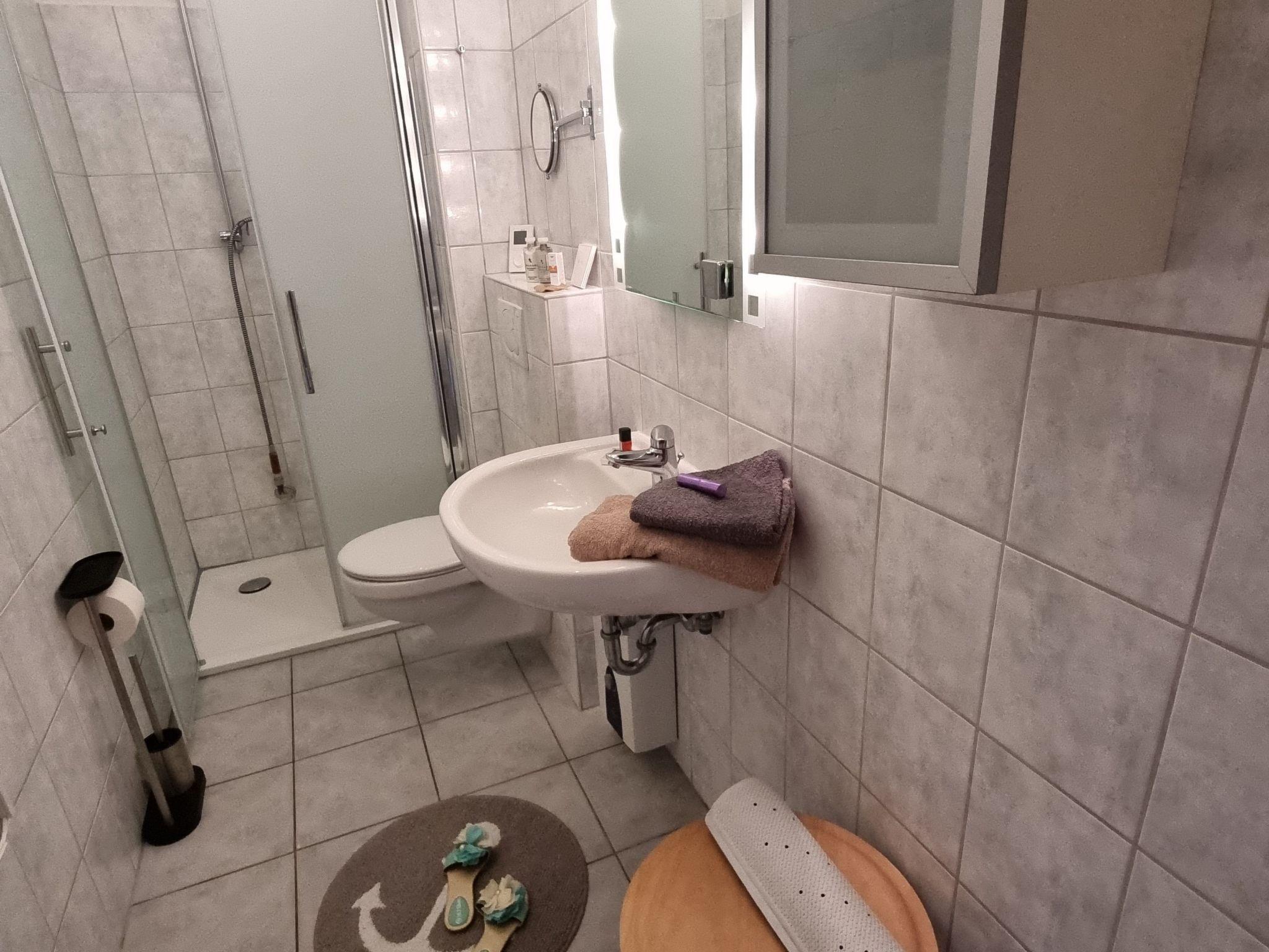 - The bathroom with an almost floor-level shower is well equipped and offers plenty of storage space. There is also a washing machine for small laundry items.
