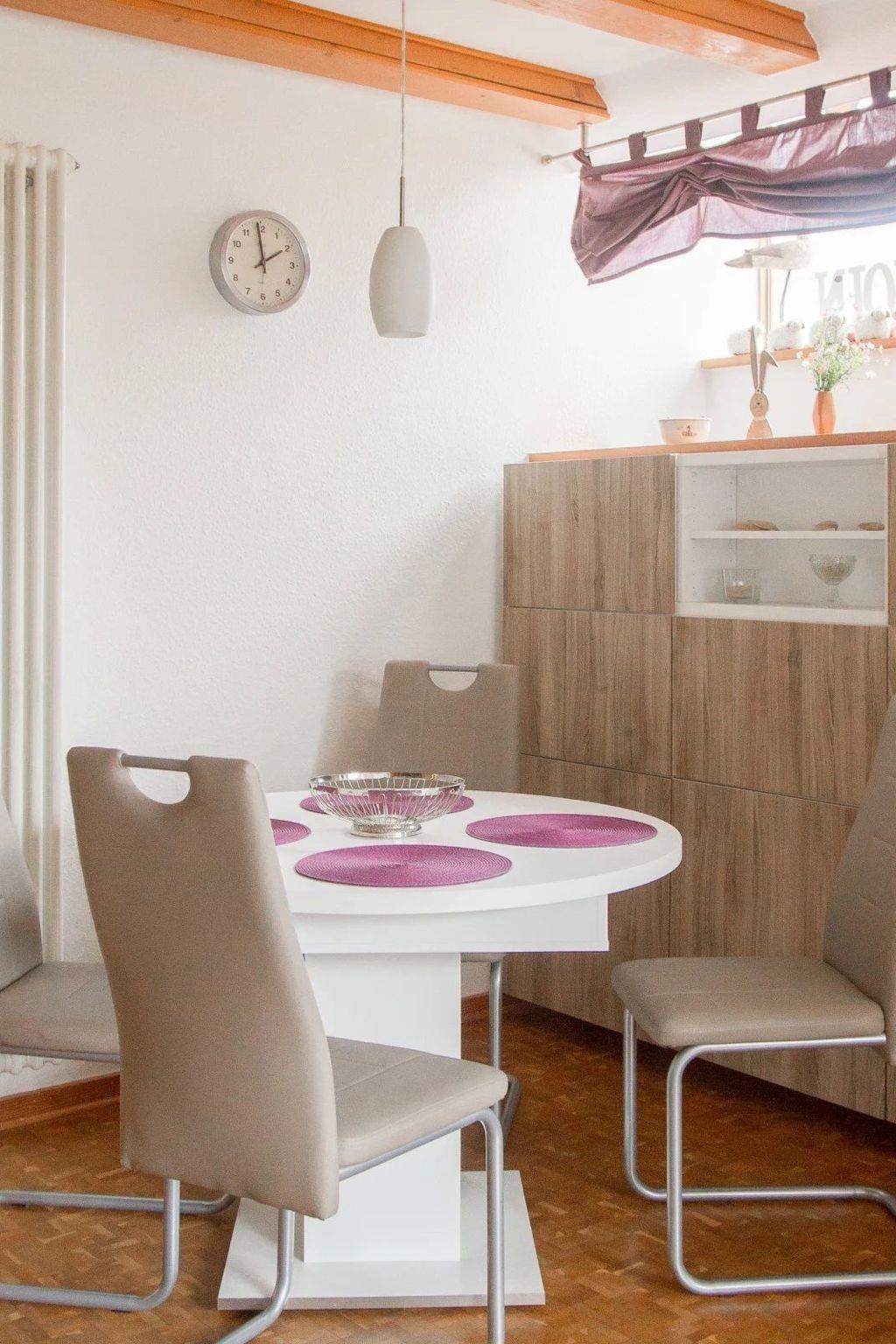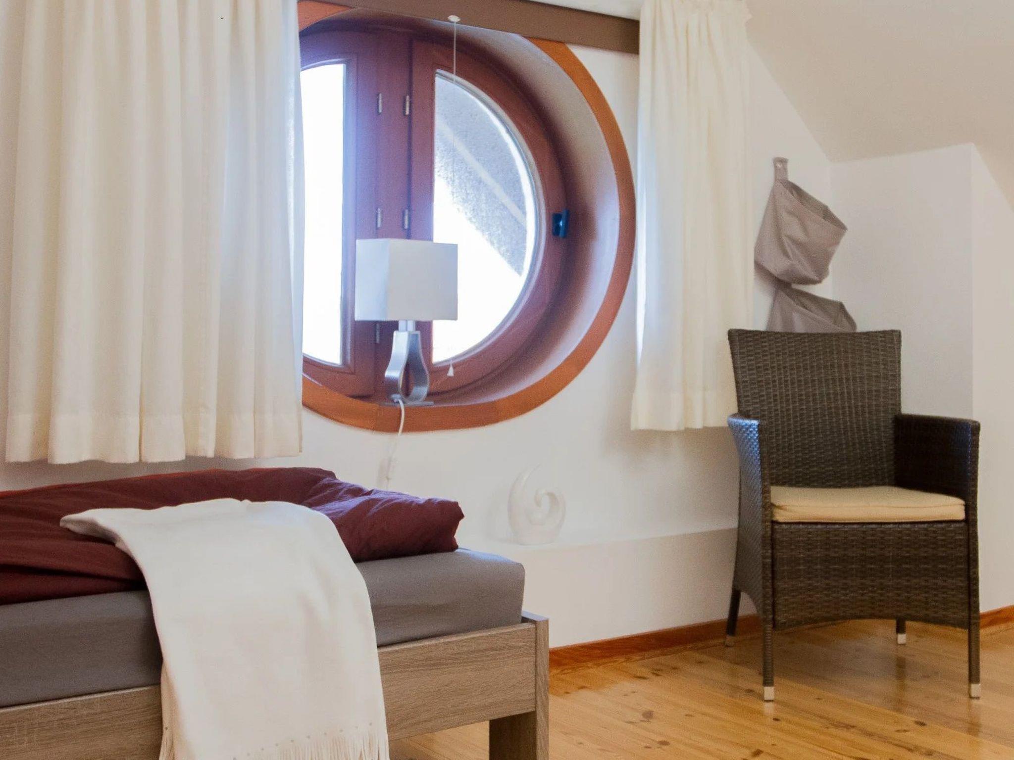 The "Moin Moin" holiday flat is a two-storey flat on the upper and top floor of an attractive designer house that plays with maritime style elements. The rounded windows, which extend far beyond the corners of the house, provide a marvellous panoramic view.