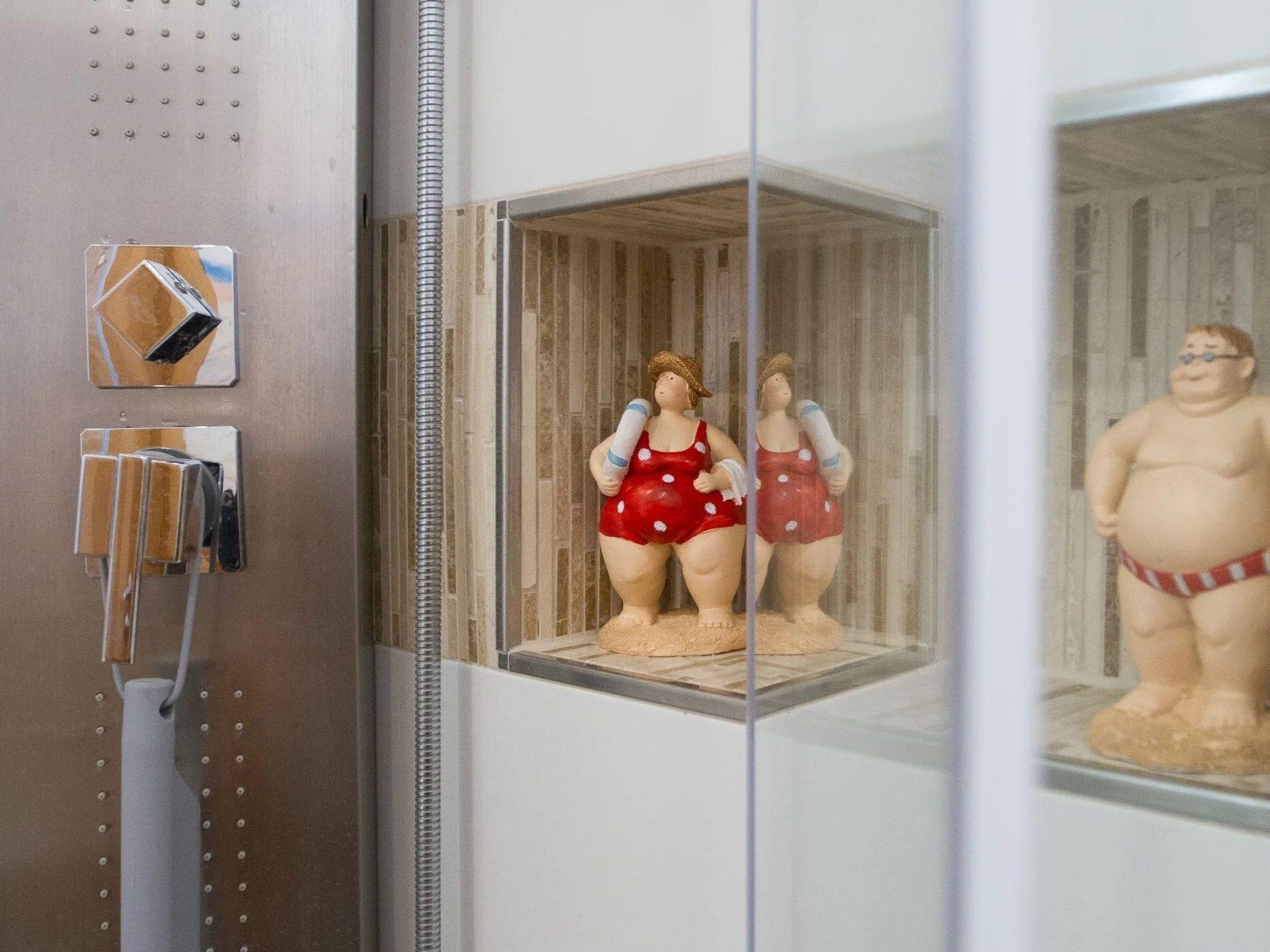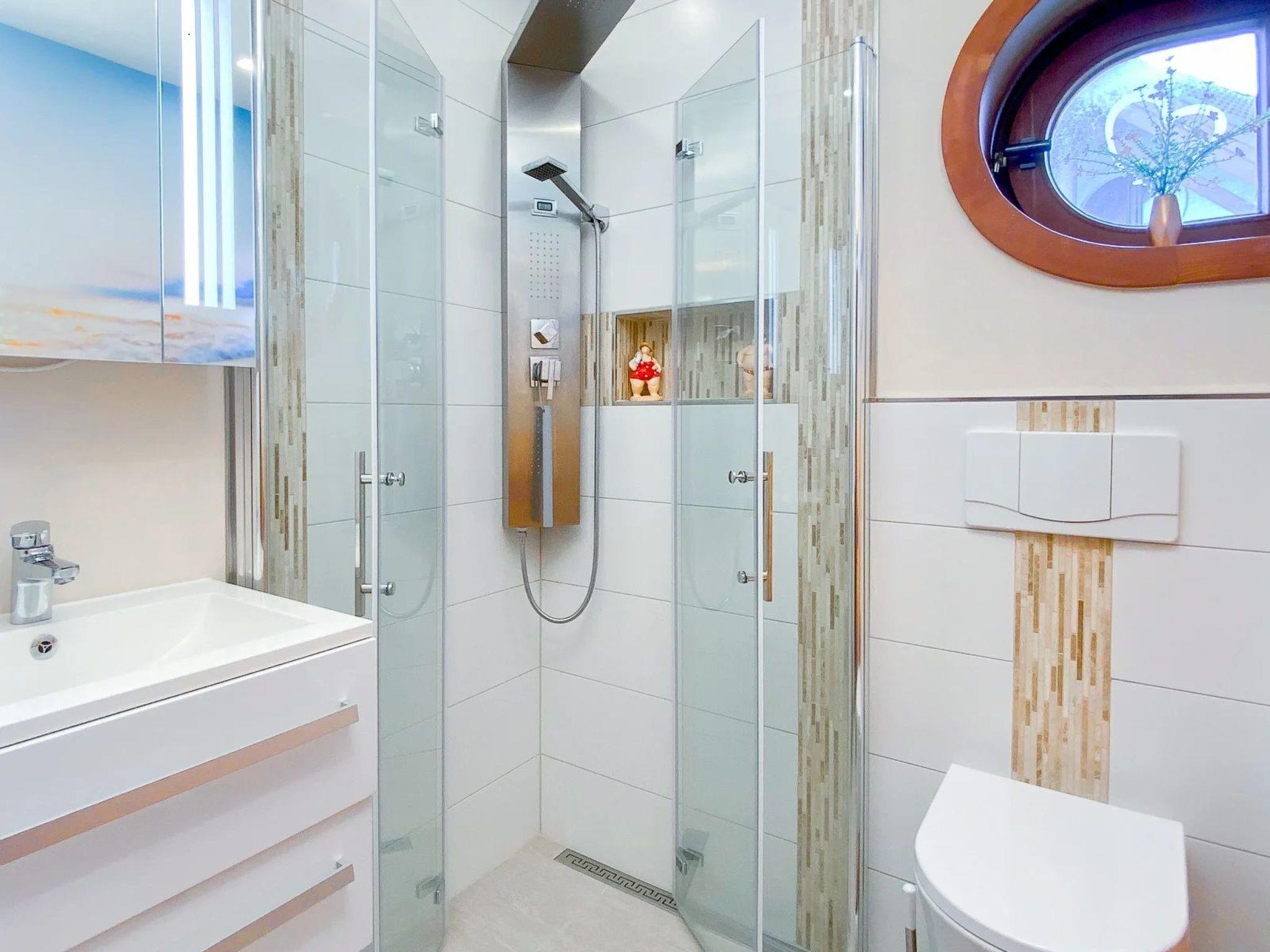 The spacious balcony, whose border is reminiscent of a railing, sets the scene for a trip on a traditional sailing boat or a relaxing stay on a magnificent ship.