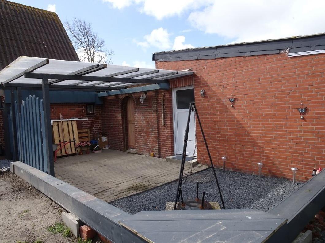 Vor dem eigenen Eingang befindet sich ein großer Terrassenbereich mit Gartenmöbeln, welcher teilweise überdacht ist.
