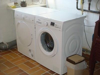 Vier Doppelhaushälften teilen sich den Hauswirtschaftsraum mit Waschmaschine und Wäschetrockner (beides Münzbetrieb). Hier steht auch für jedes Haus ein Wäscheständer und im Regal stehen Bücher und Spiele.